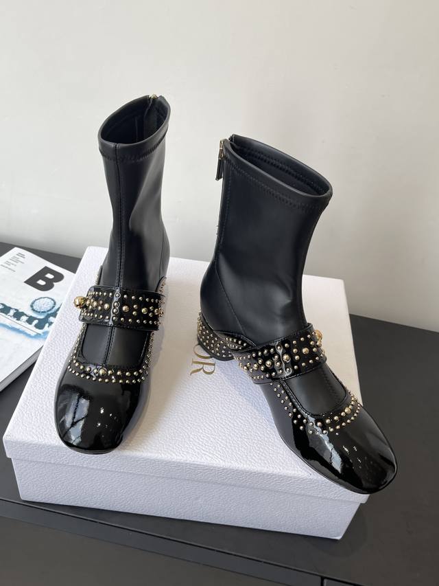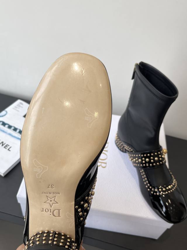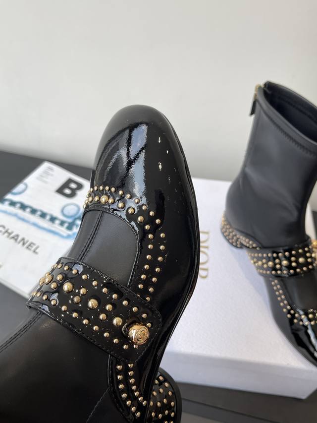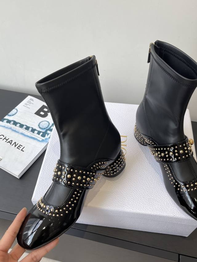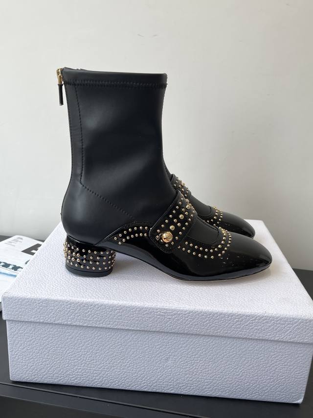 Dior 迪奥 秋冬新款朋克风格铆钉弹力靴 明星同款Cd扣字母Logo五金扣方头低跟短靴 市面顶级版本 材质鞋面进口牛漆皮 水染羊皮内里 意大利注塑真皮大底 跟