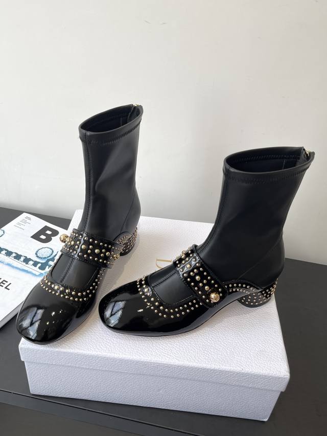 / Dior 迪奥 秋冬新款朋克风格铆钉弹力靴 明星同款Cd扣字母Logo五金扣方头低跟短靴 市面顶级版本 材质鞋面进口牛漆皮 水染羊皮内里 意大利注塑真皮大底 跟