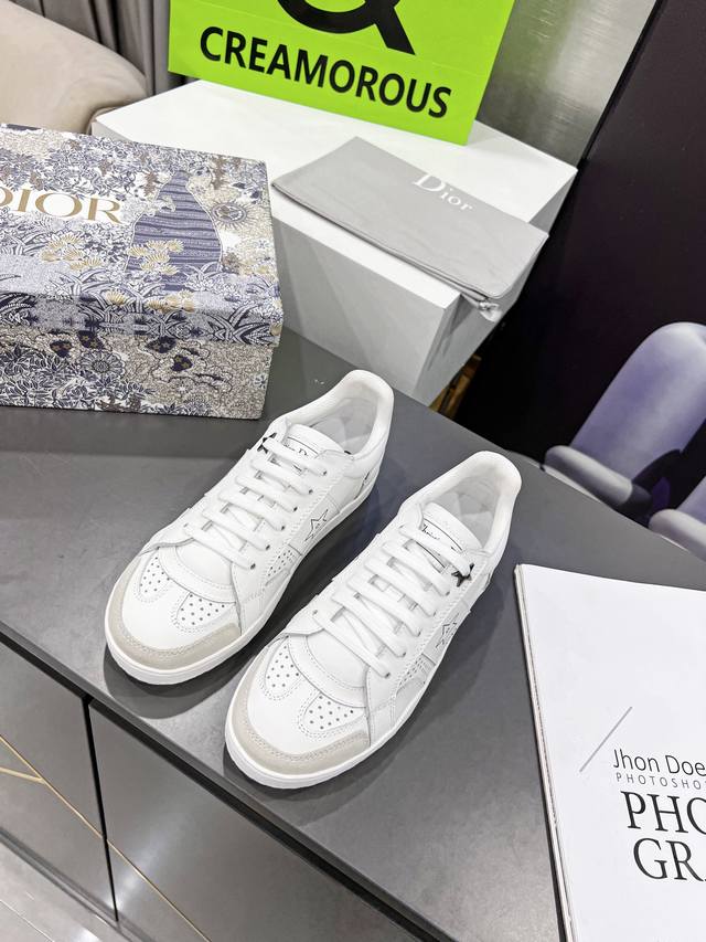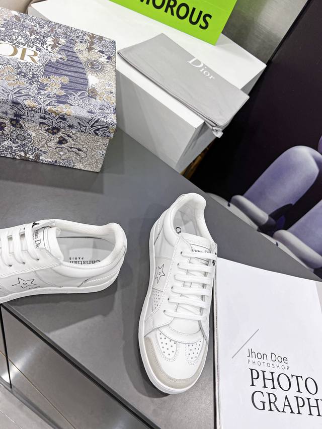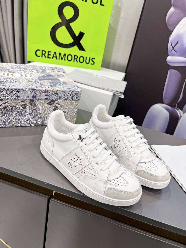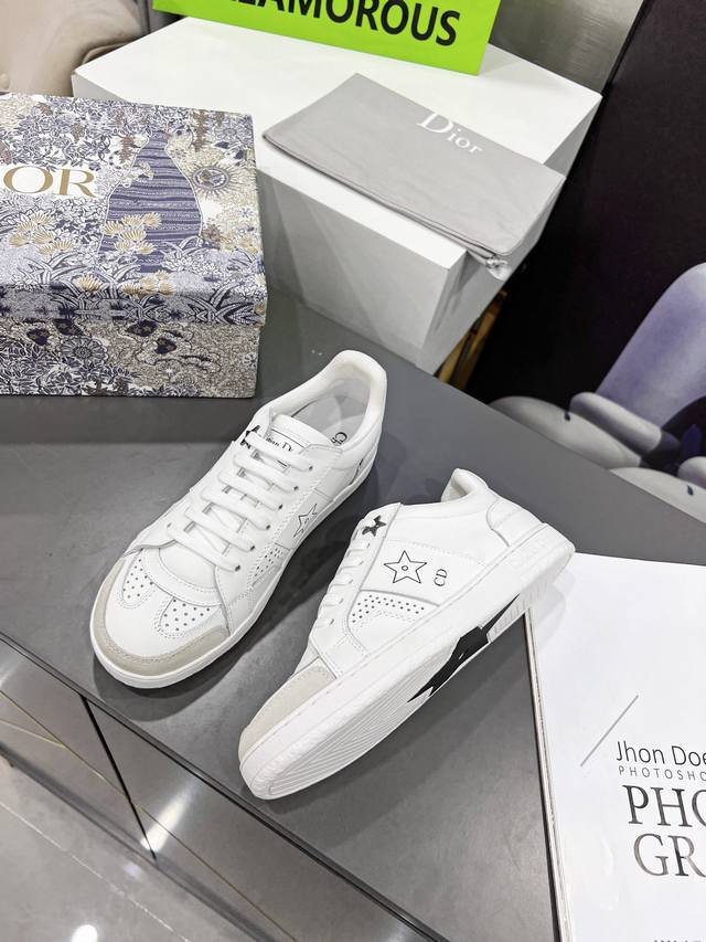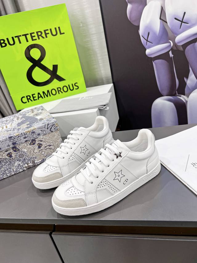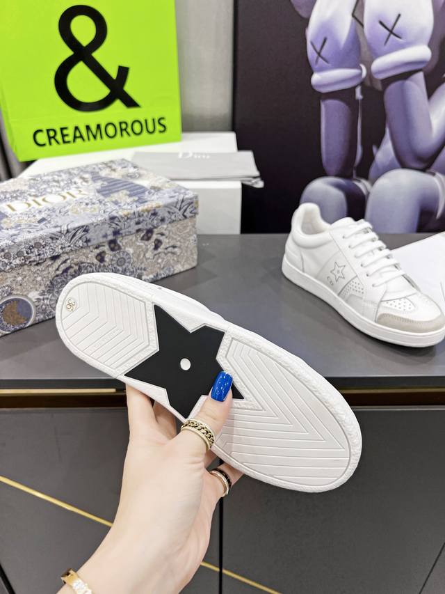 Dior 迪奥 花色同步官网更新啦,这款 Dior Star 运动鞋为新款经典单品,经久不衰的设计别具一格。采用白色牛皮革精心制作,饰以同色调绒面革镶片。点缀以金色调“Cd”和“Christian Dior Paris”标志,金色饰面金属星星装饰鞋带孔眼,提升格调。原版一比一复刻,款式轻盈,搭配标志性的薄鞋底,四季皆宜,可与各式休闲造型搭配,增添点睛之笔。