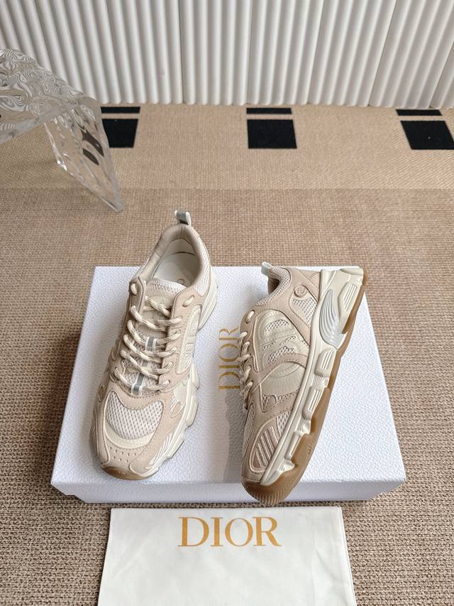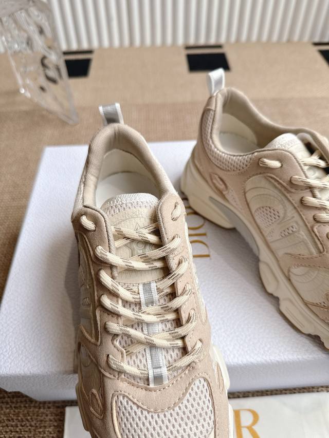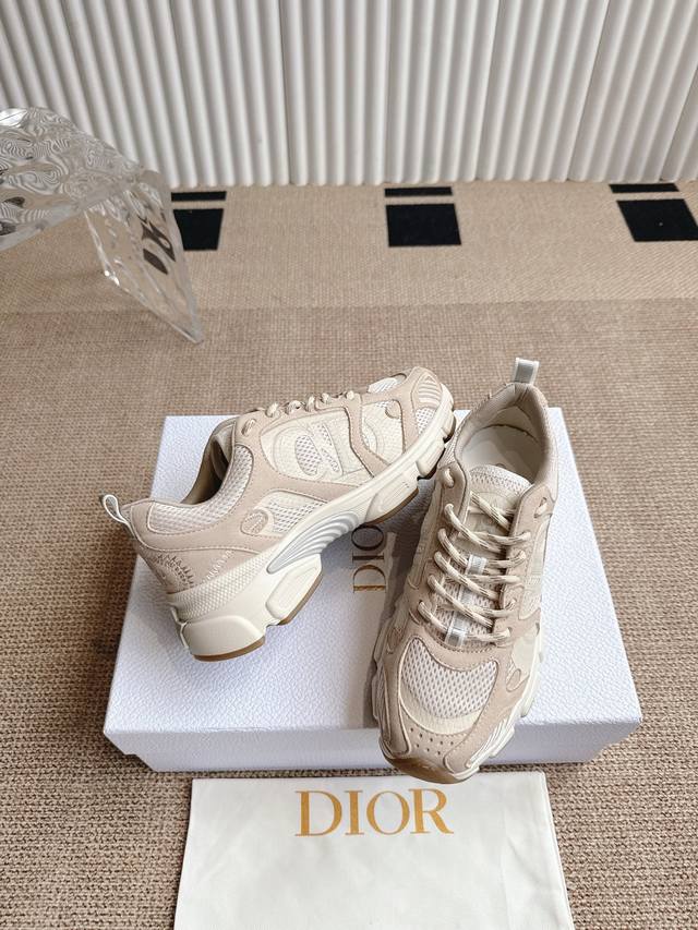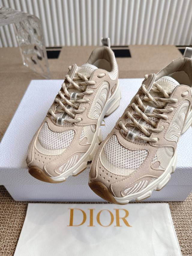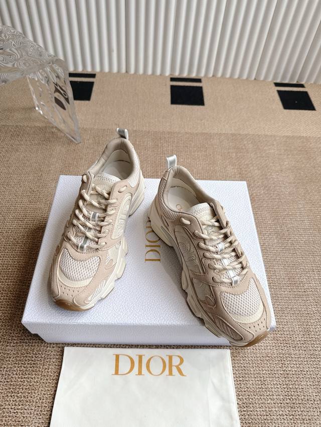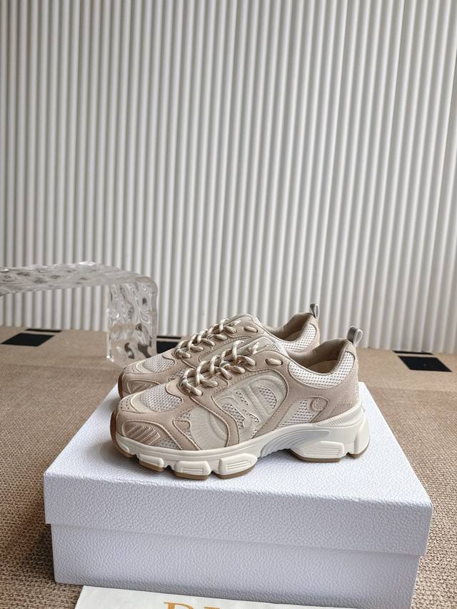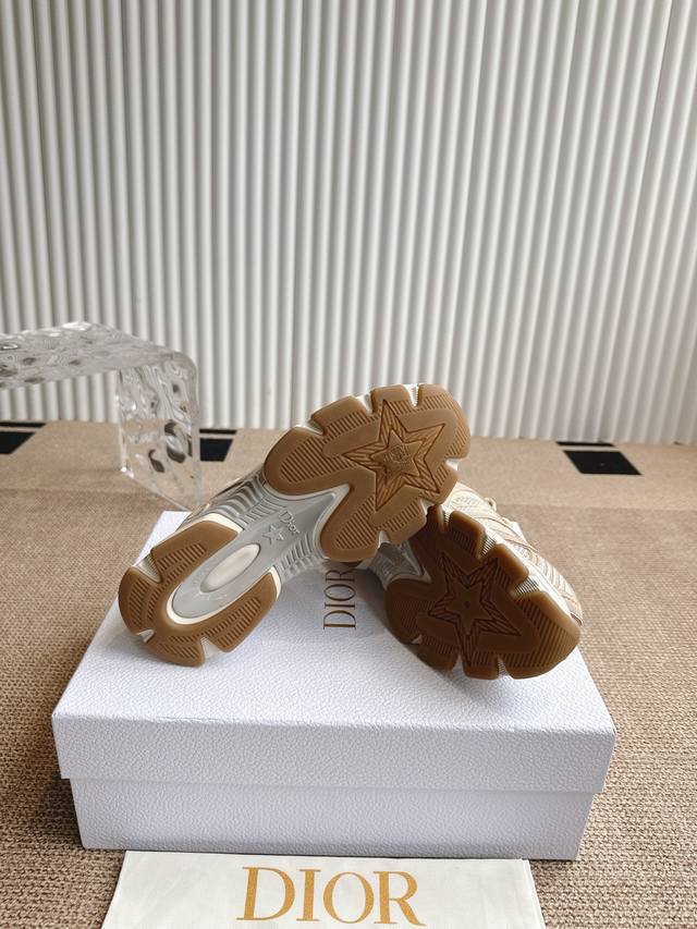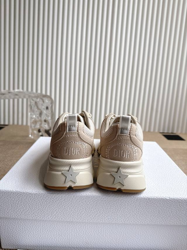 这款 Dior Vibe 运动鞋融入 Dior 的高订精神,重新诠释经典跑鞋。白色网眼织物饰以 Oblique 印花图案,搭配金色和银色调层压皮革效果镶片,打造对比鲜明的时尚造型。以 3D 效果细节、后侧幸运星符号、鞋舌和后侧提拉环上的标志等经典细节进一步点缀。轻盈的鞋底饰以灰色星星,与各式休闲或优雅单品相得益彰,打造摩登造型。