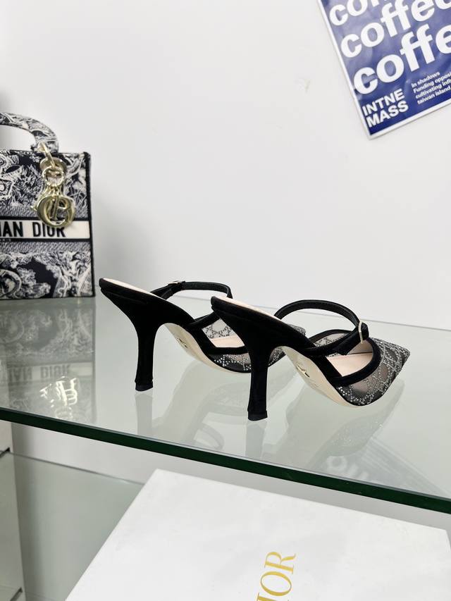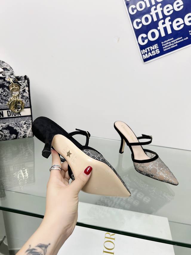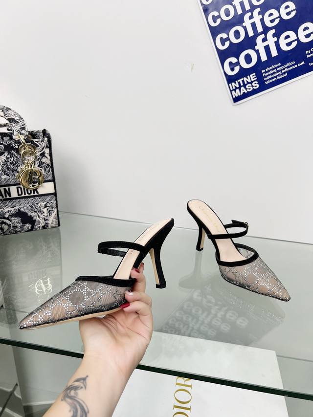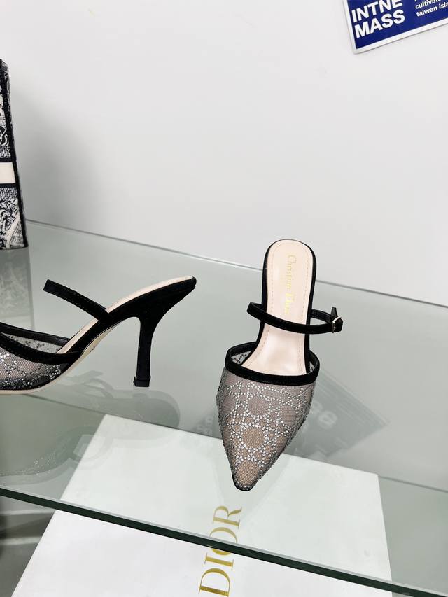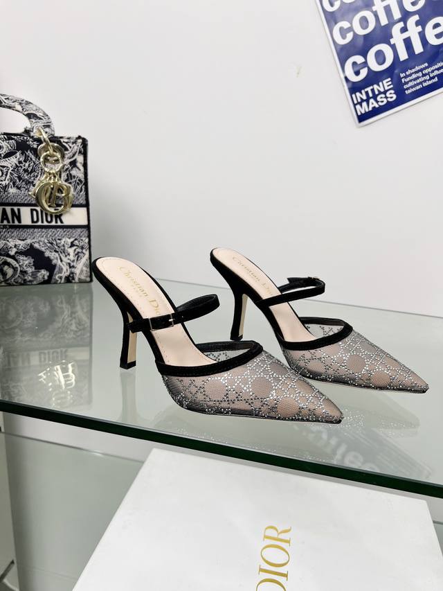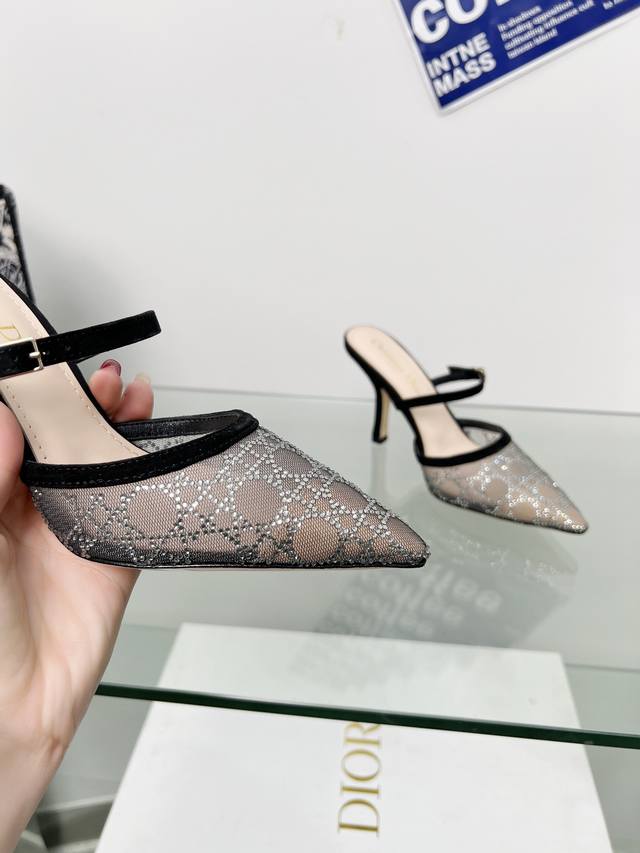 Dior 迪奥 2025春夏走秀新款bling...Bling...水晶鞋 Capture一字带高跟穆勒女鞋 明星同款水钻方头藤格纹图案猫跟拖鞋 市面顶级高端版本 独家发售