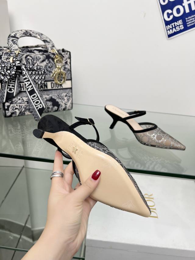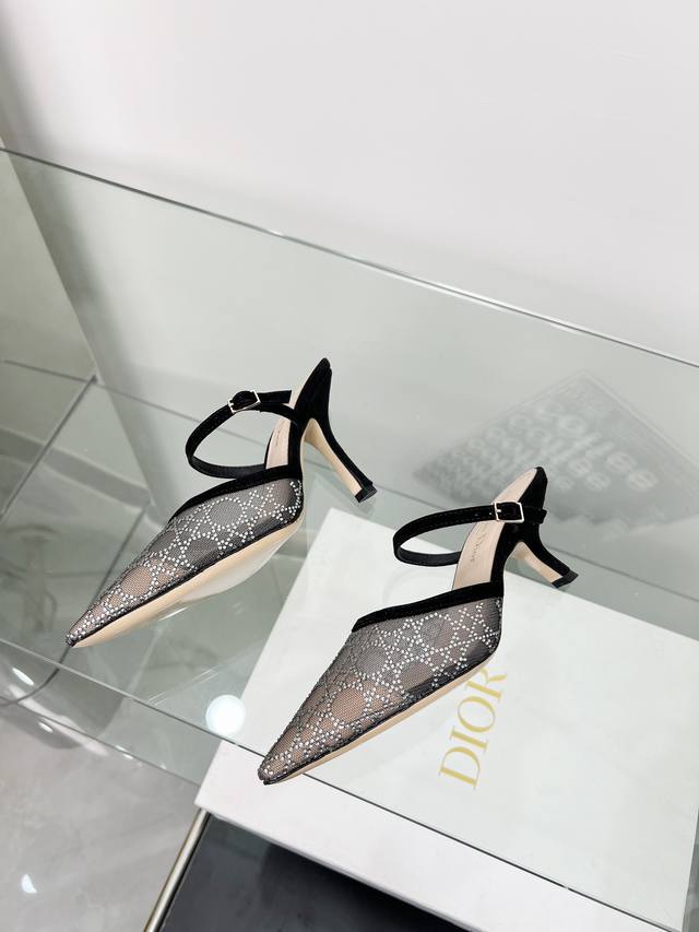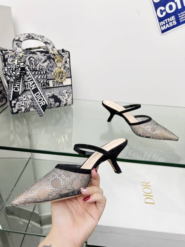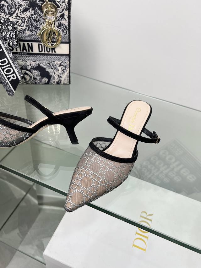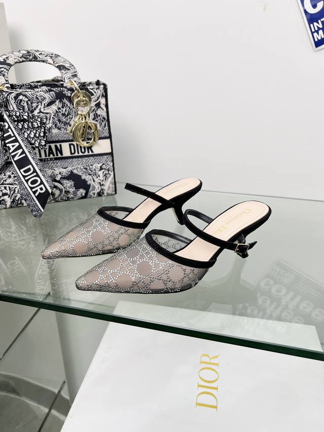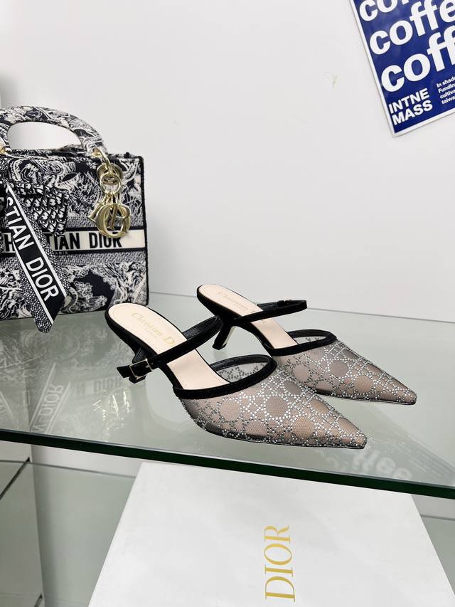工厂价Dior 迪奥 2025春夏走秀新款bling...Bling...水晶鞋 Capture一字带高跟穆勒女鞋 明星同款水钻方头藤格纹图案猫跟拖鞋 市面顶级