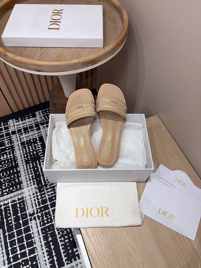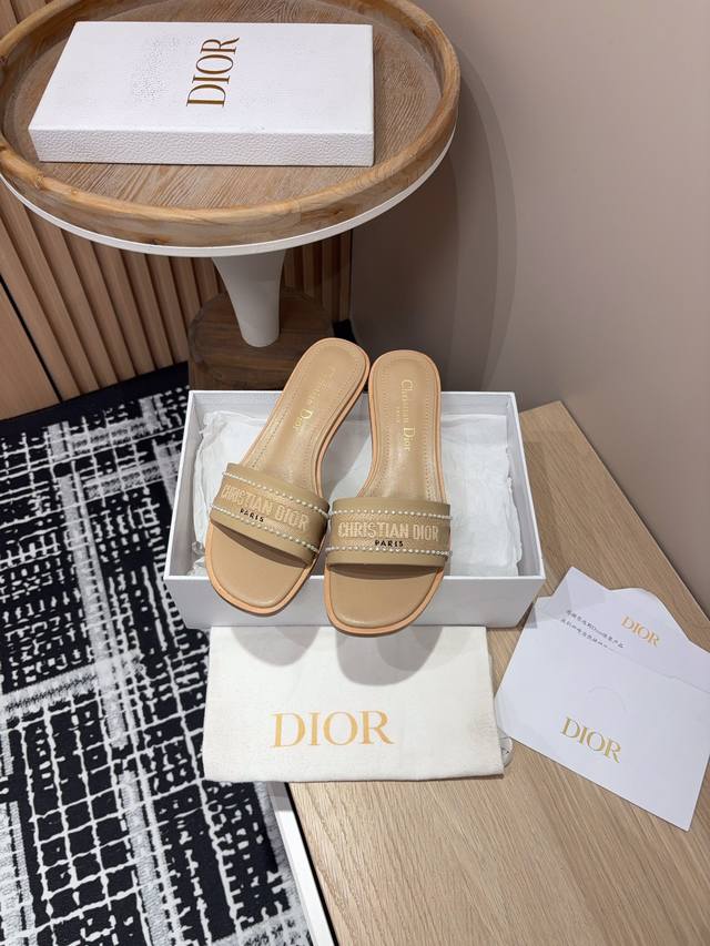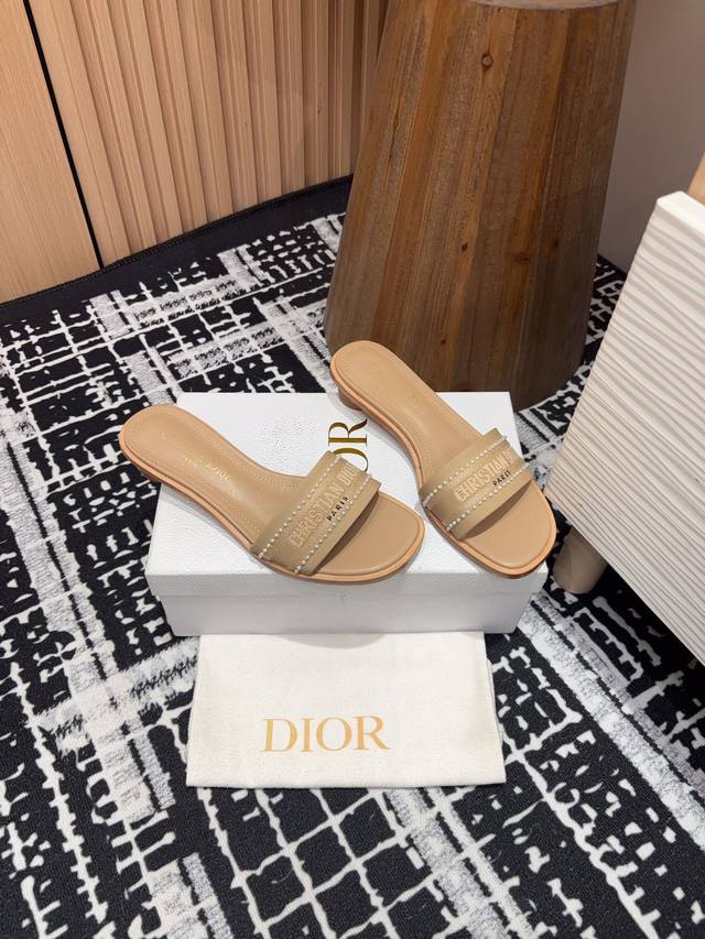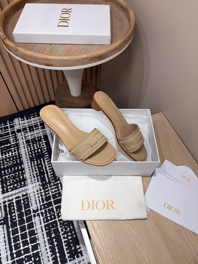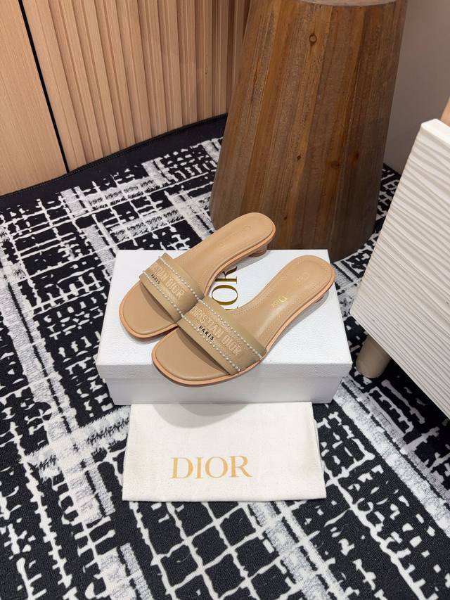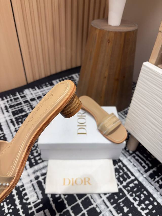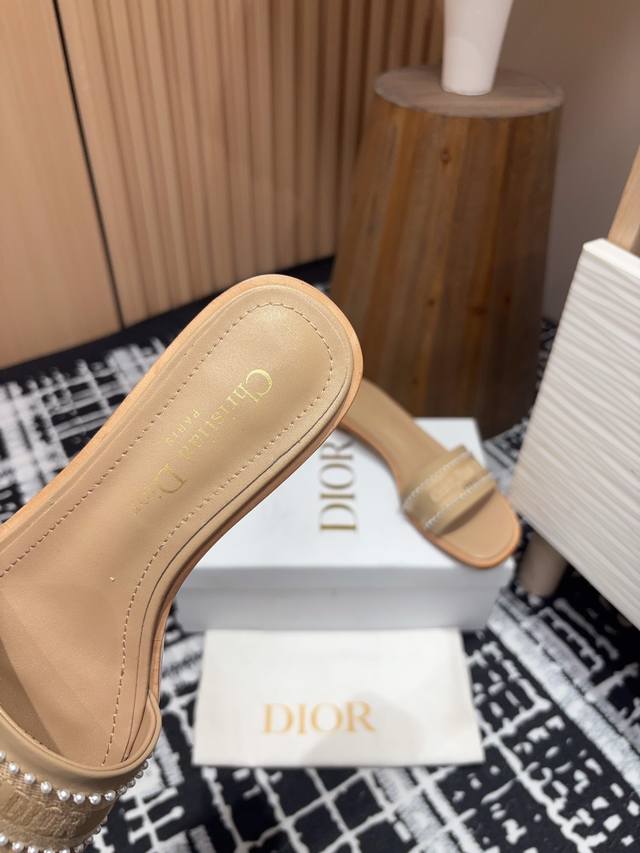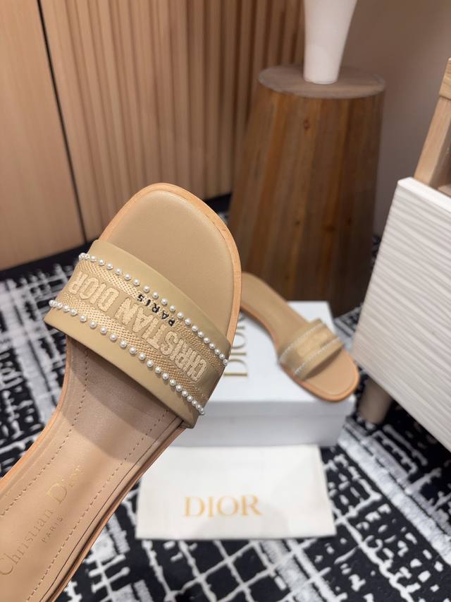 25Ss春夏新款dior D-Lane 凉拖圆柱粗跟一字珍珠刺绣拖鞋