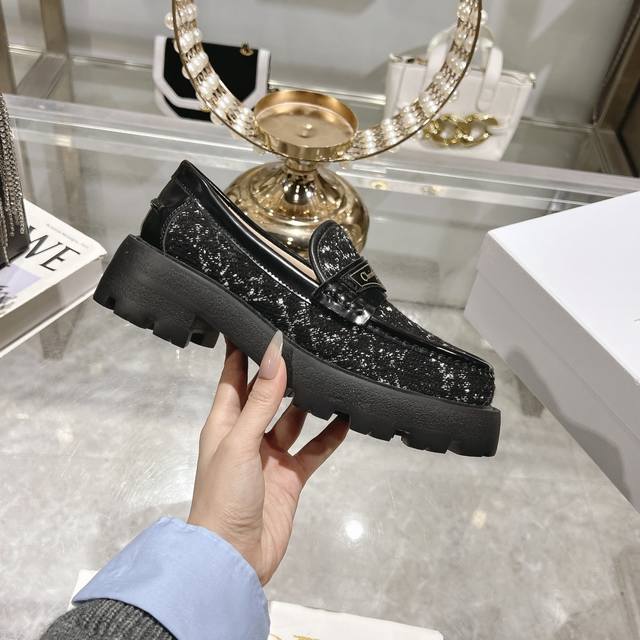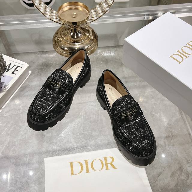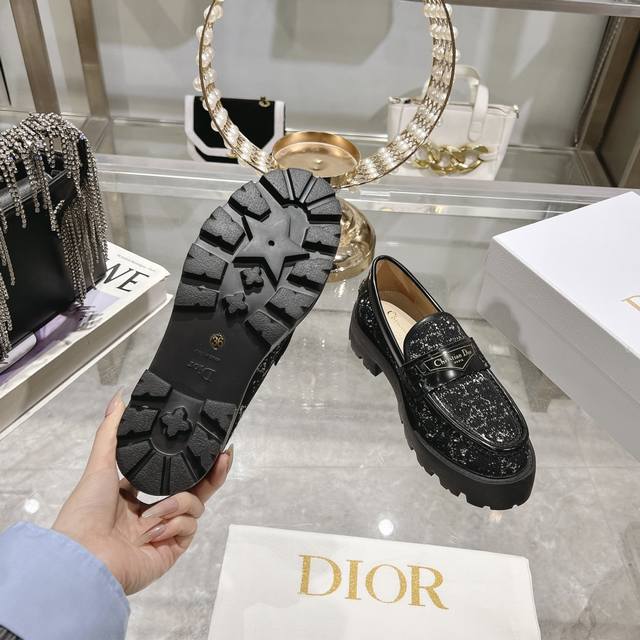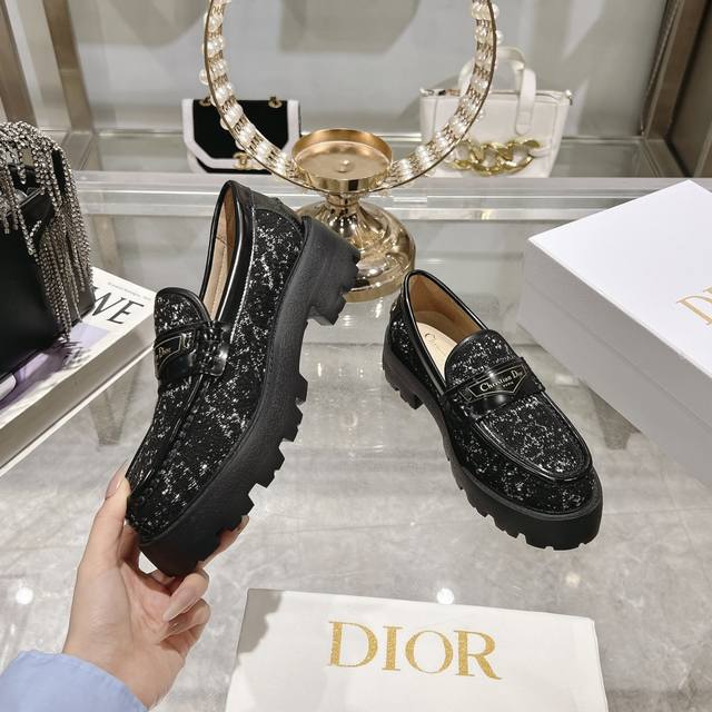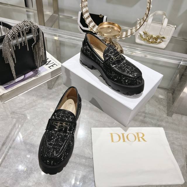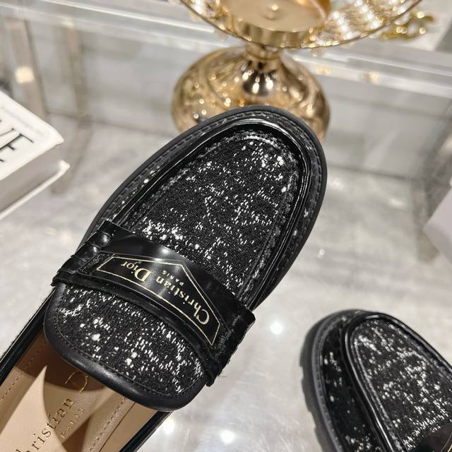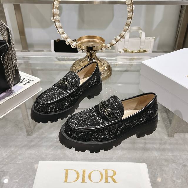 迪奥 Dior 2024秋冬新款 D-Boy 字母logo拼色厚底女鞋 明星同款一脚蹬皮带扣圆头复古低跟乐福单鞋材质:鞋面进口开边珠牛皮拼接环保藤格纹粗花呢+水