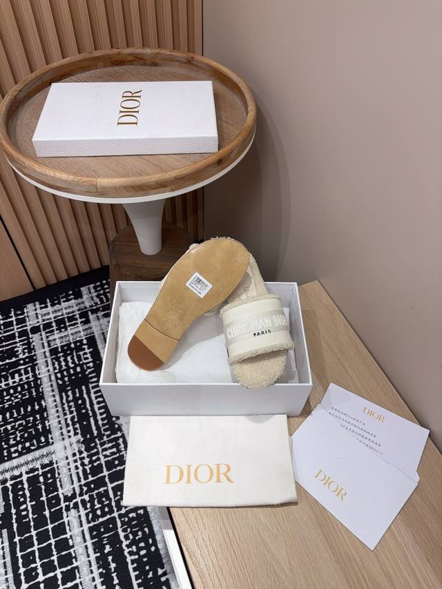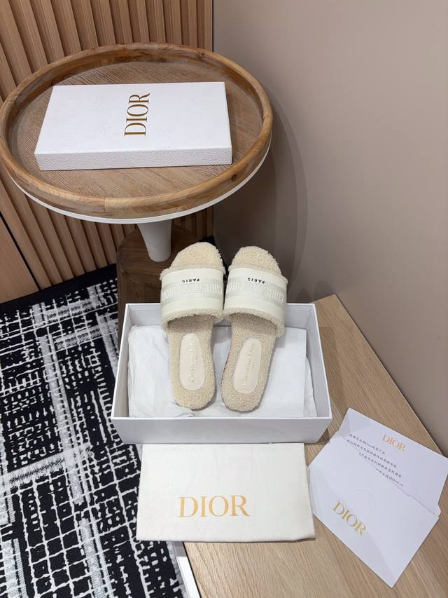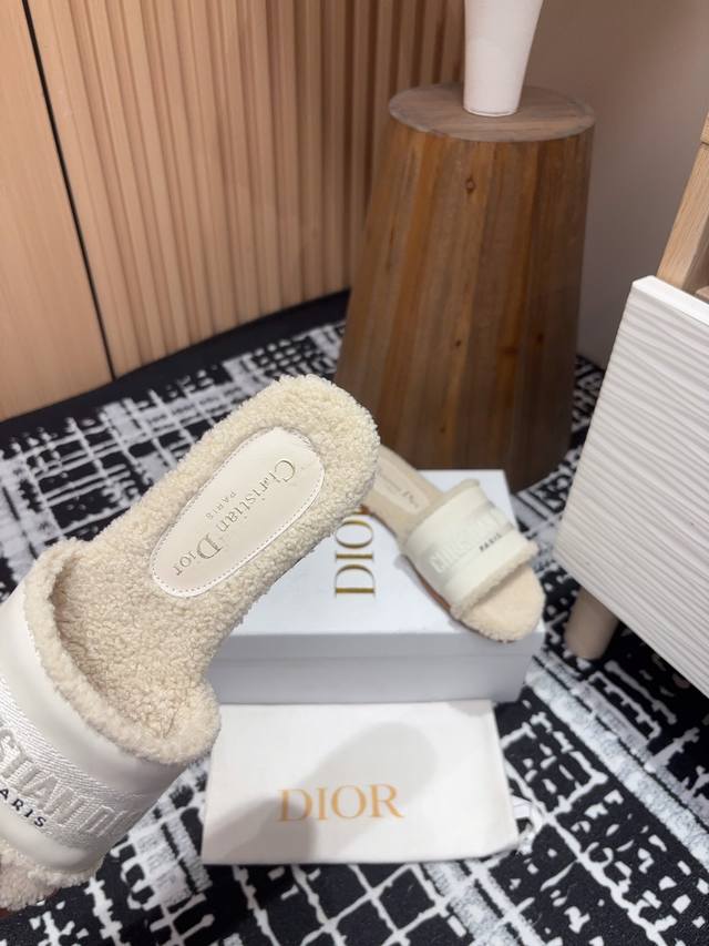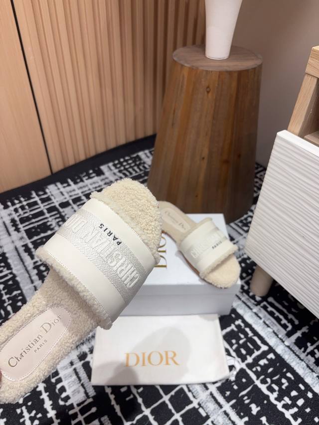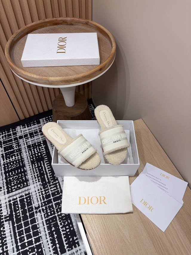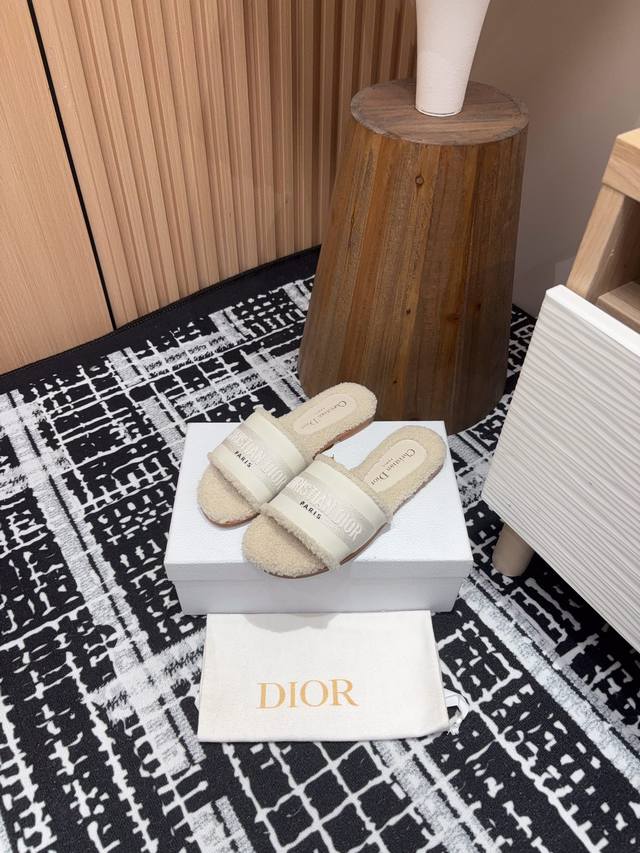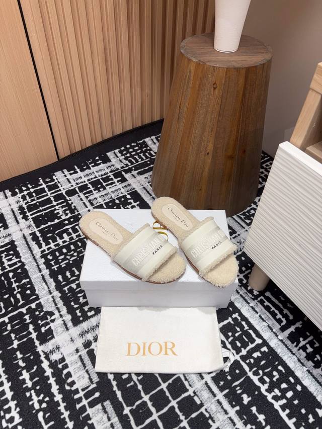 24Ss秋冬新款dio*Dway 平底一字刺绣羊羔毛拖鞋