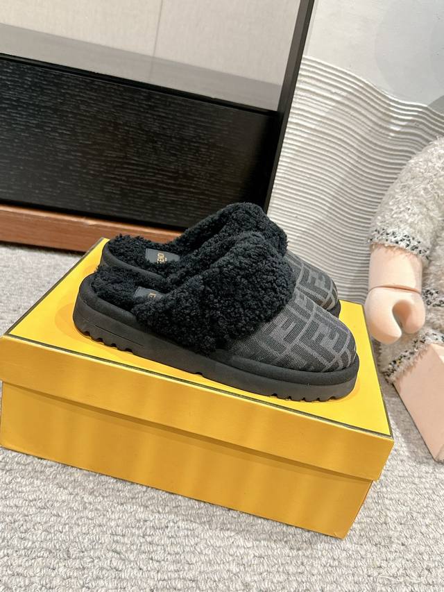 这款半拖皮面压花+羊羔毛搭配发泡材质鞋底,