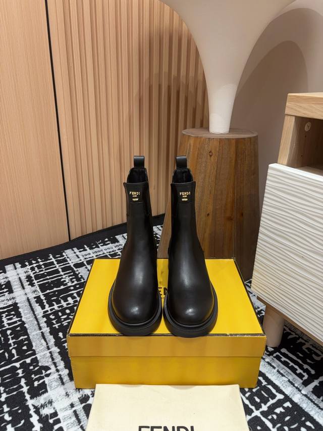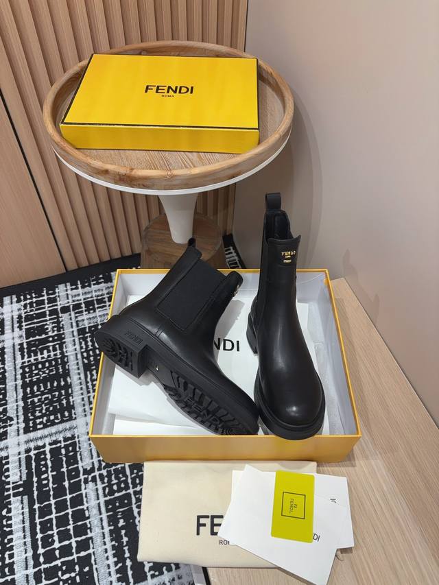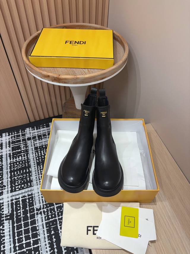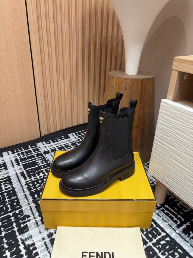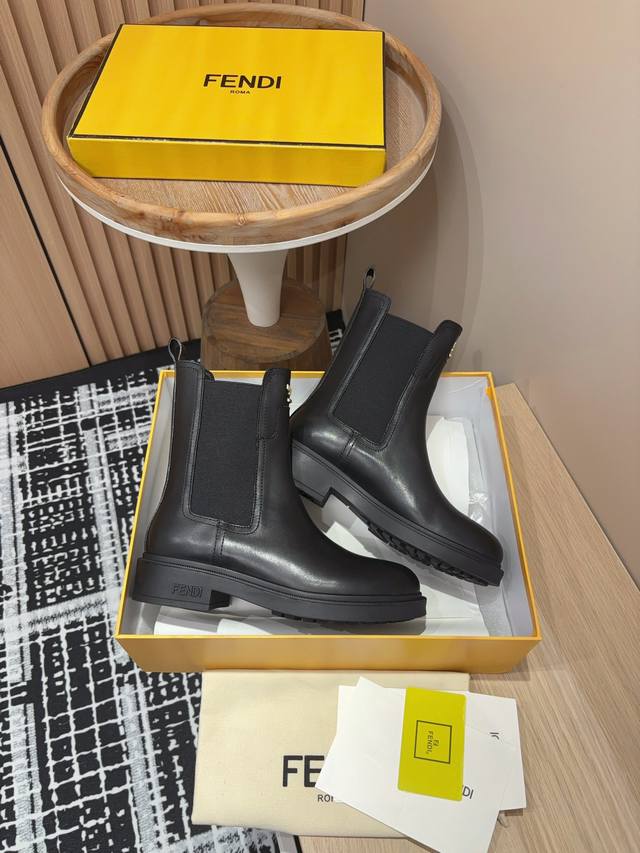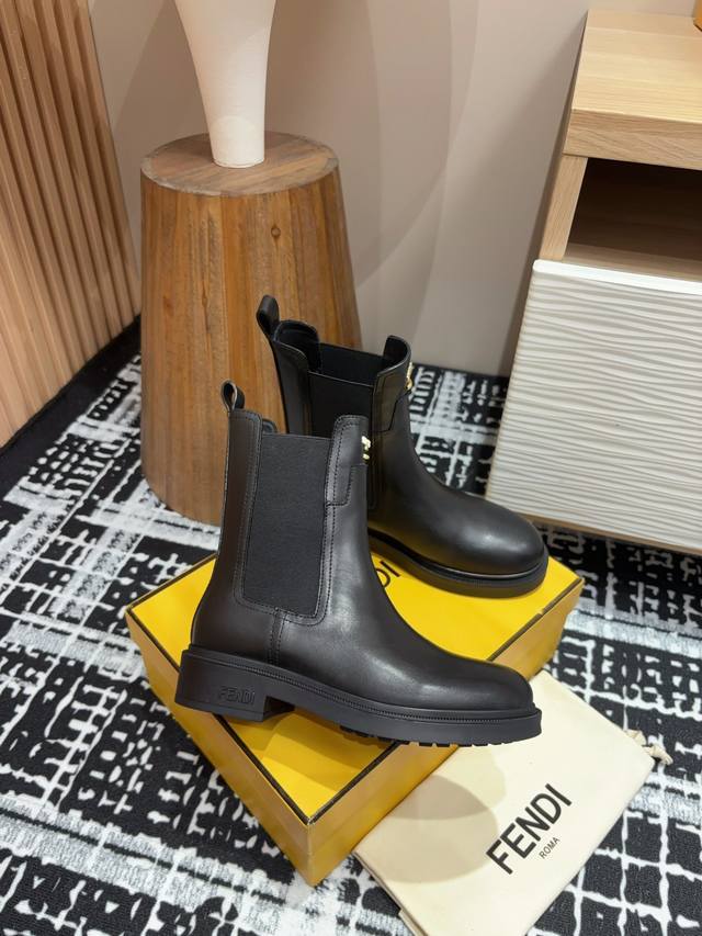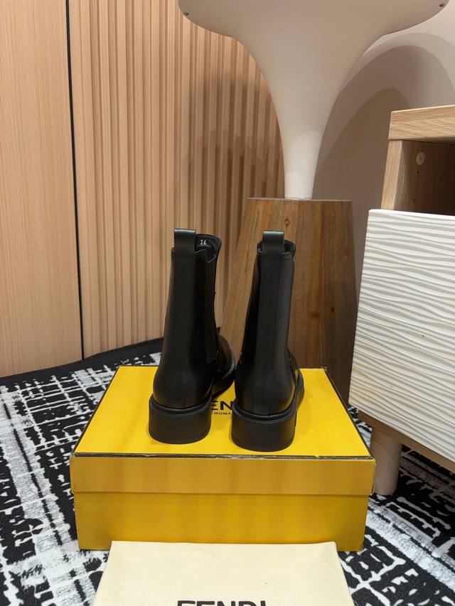 Fendi Filo机车靴,圆头,侧面有松紧嵌饰。黑色皮革材质。背面饰金属selleria缝线,正面饰金属凸纹压花fendi Roma压花。橡胶鞋底,鞋跟侧面饰有fendi字样。