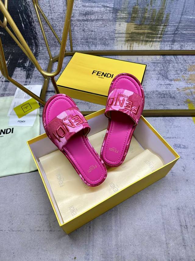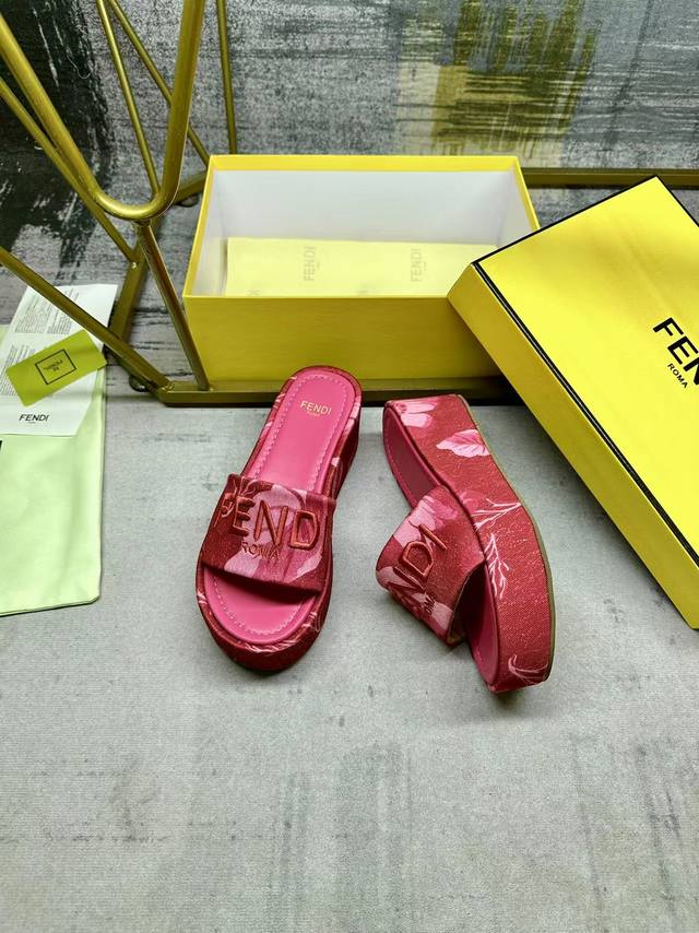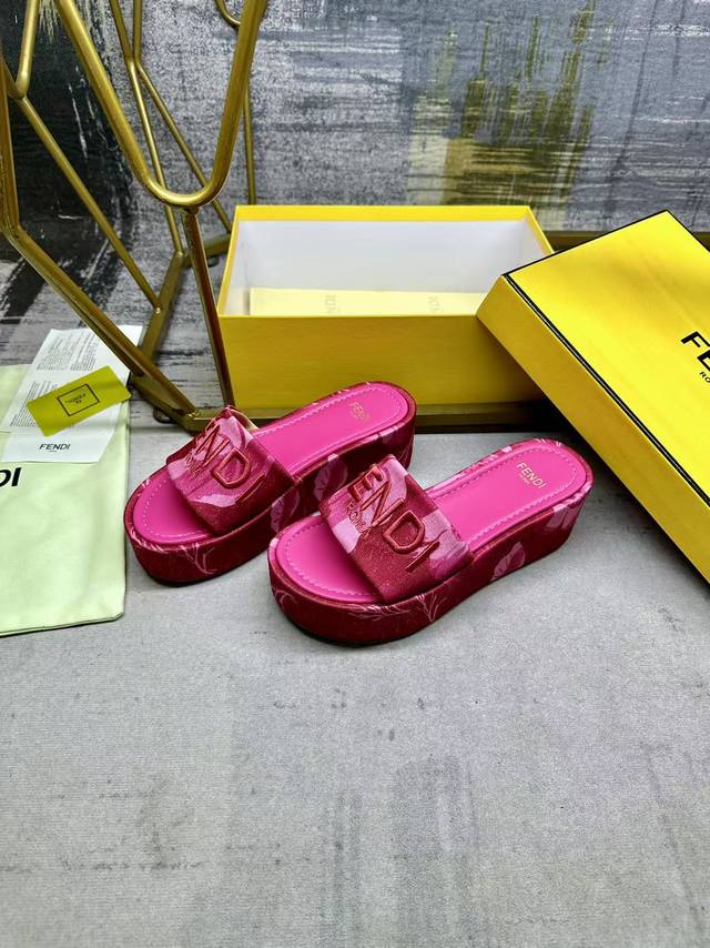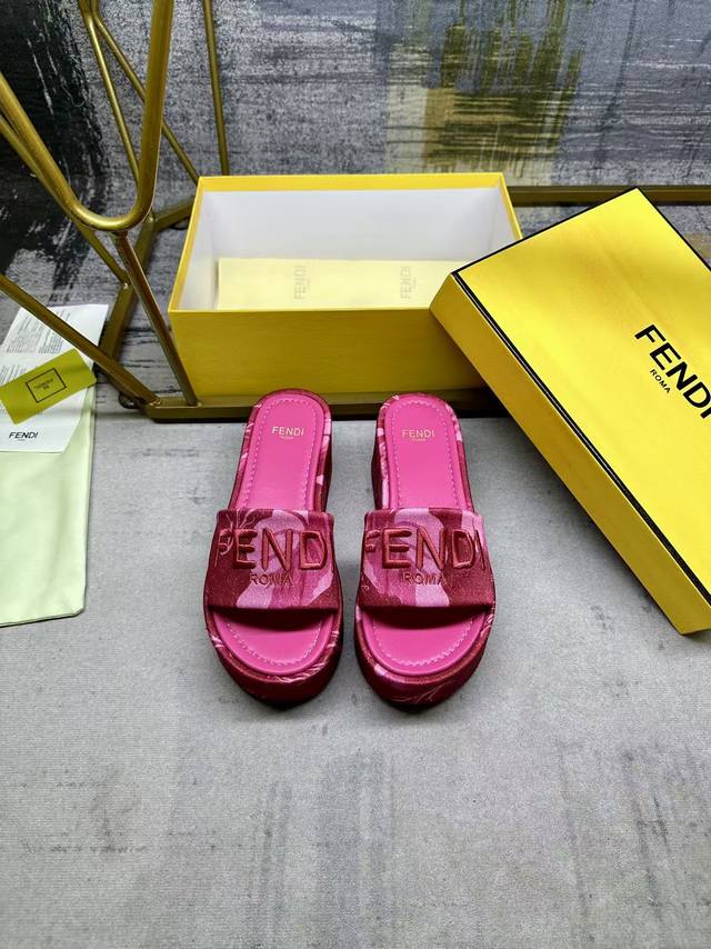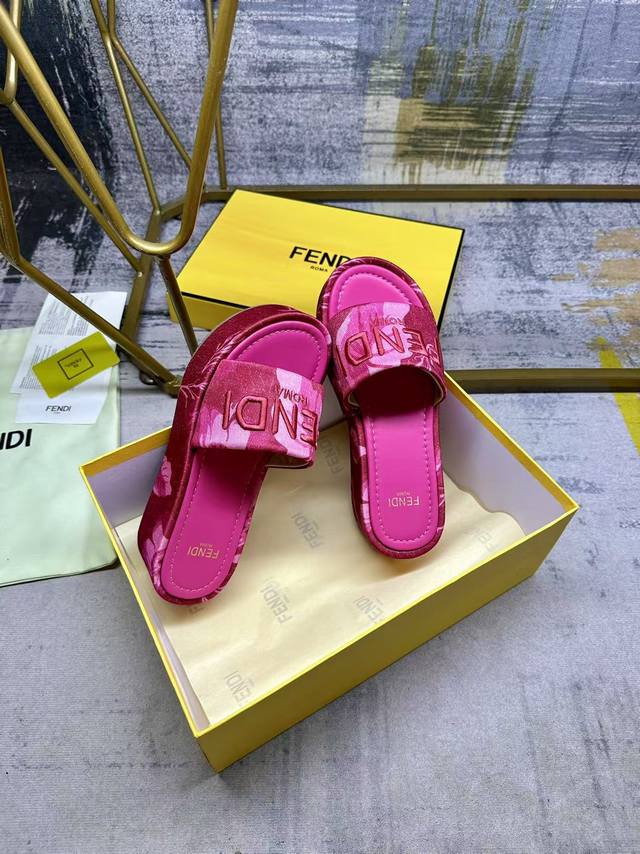 fendi最新爆款宽带厚底拖鞋,彩色印花布材质,饰有浅色撞色印花图案,同色皮面内底,同色Fendi纱线刺绣,35-42码,