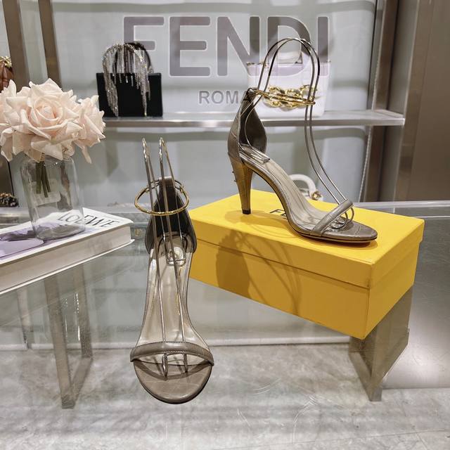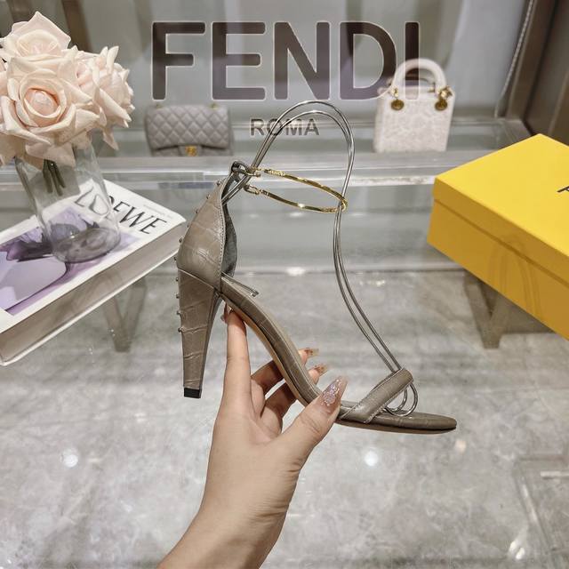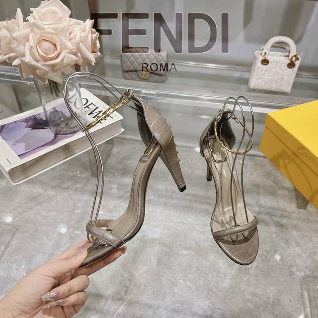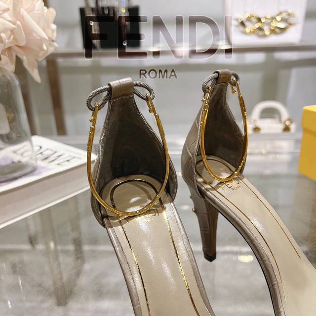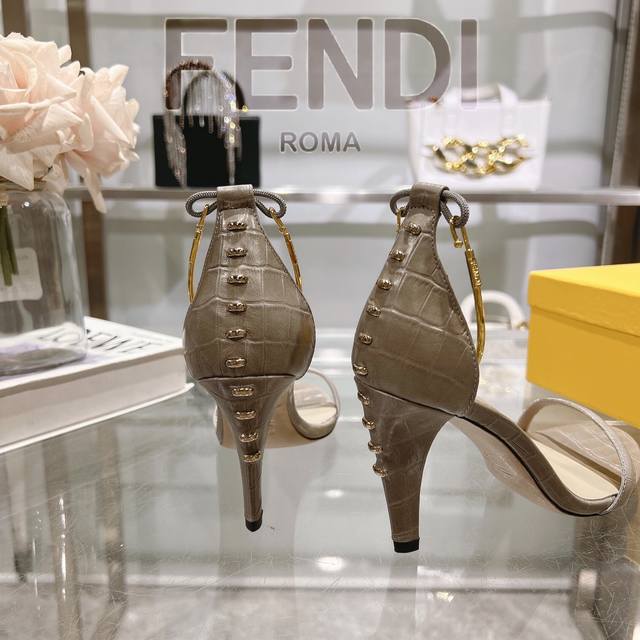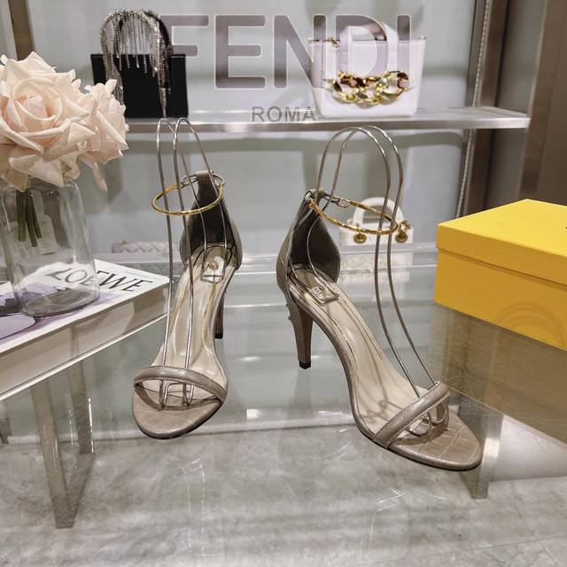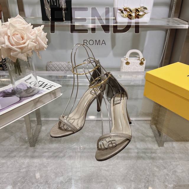 FENDI Filo皮革高跟凉鞋 亮面压纹皮革材质 ,搭配金属色踝带,金属质感石纹皮革材质更添时髦质感。脚踝精巧五金 饰带,鞋跟饰有金属Selleria缝线 。简洁利落设计 更自由、时髦、大气好穿。