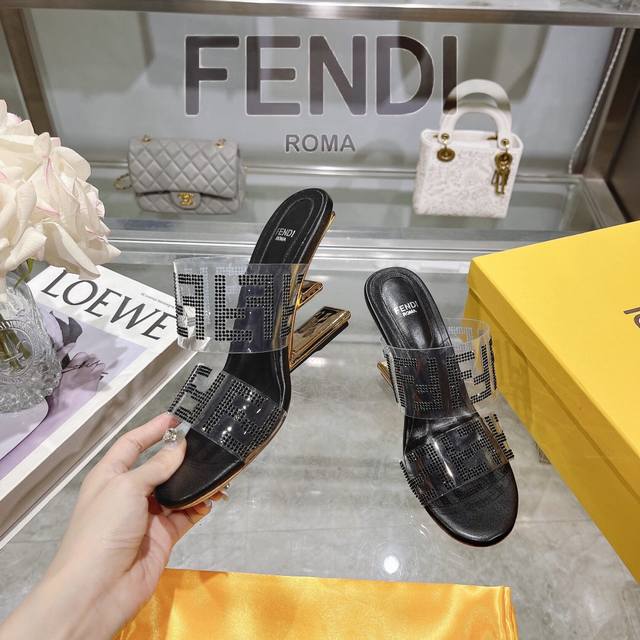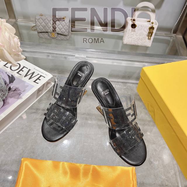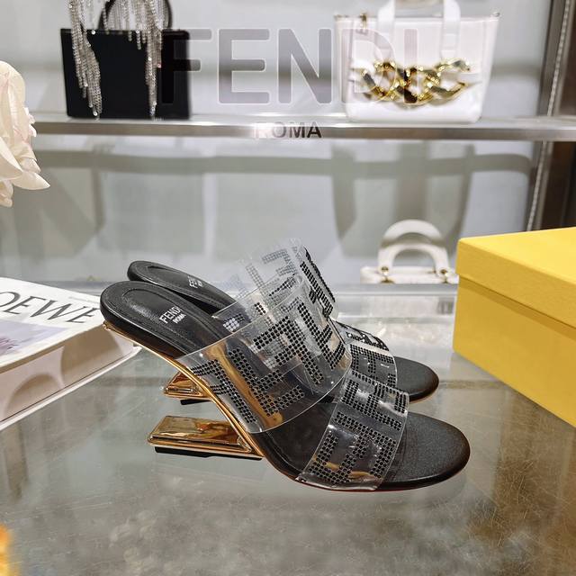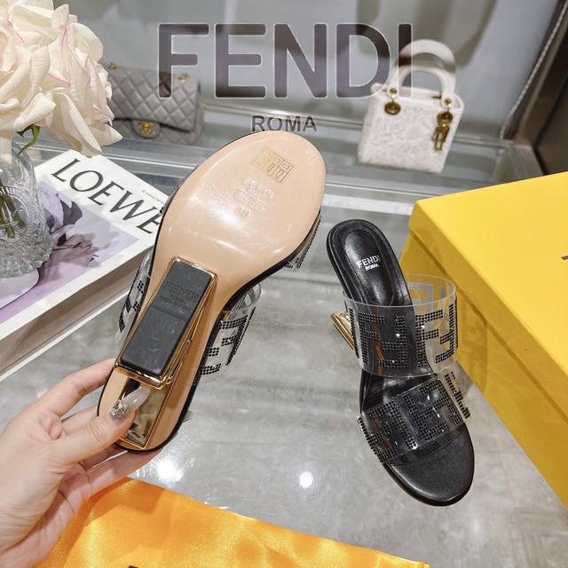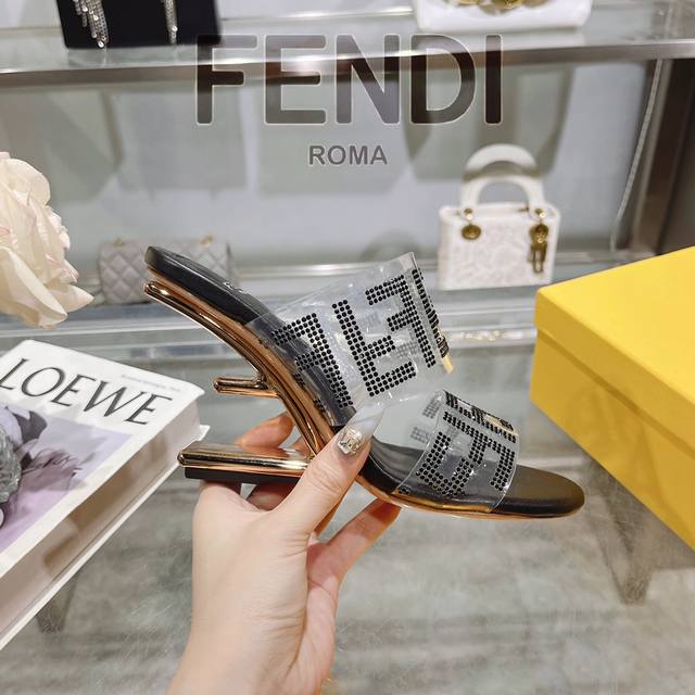 工厂价 女装女鞋 运动原单 芬迪 FRIST 圆头烫钻胶片高跟鞋拖 高版本烫钻系秀场款