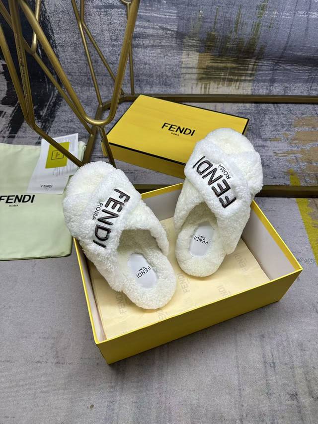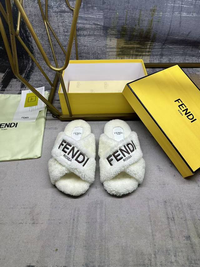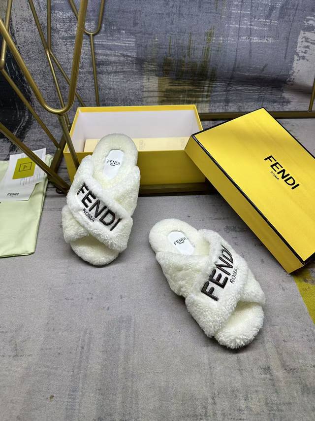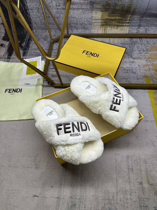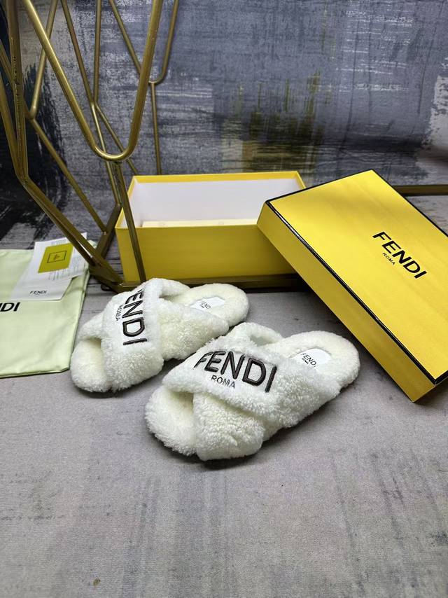 fendi最新爆款宽带交叉平底拖鞋,羊羔毛面料Fendi丝线刺绣,垫脚全包羊羔毛,35-45码。