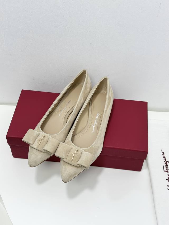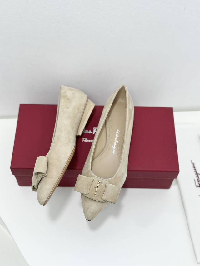 salvatore Ferragamo 菲拉格慕绒面走秀款尖头浅口viva芭蕾舞鞋 颜值真的超高喔!立体感浮雕效果logo更时髦百搭 泪滴形鞋跟灵感源自richard Serra线条玲珑的雕塑作品 Viva是vara经典鞋的升级版 比vara更年轻化,紧跟流行趋势。变身尖头鞋,但是一点都不磨脚,因为是d楦,反而更显脚瘦和纤细!新版蝴蝶结比原来更大,轮廓也更鲜明,选用跟鞋身相同配色与材质,整只鞋看起来简单又时髦。水滴跟的设计让粗跟不再笨重
