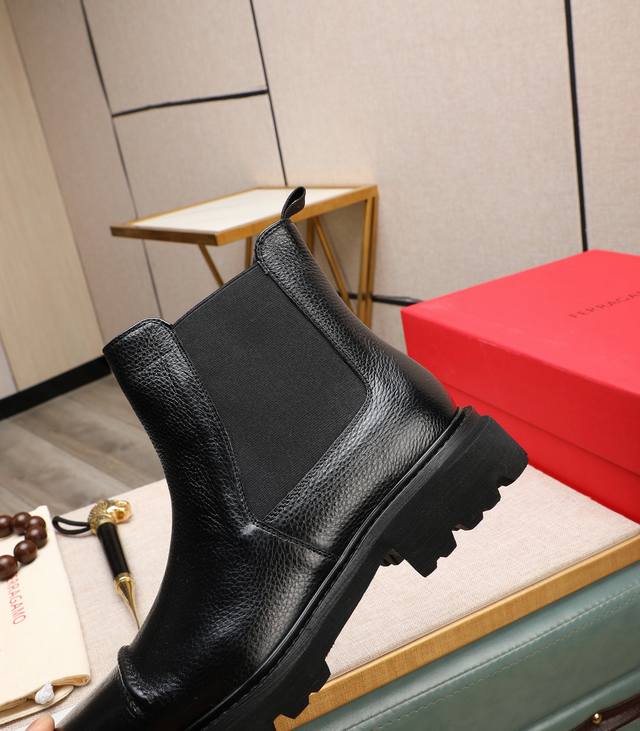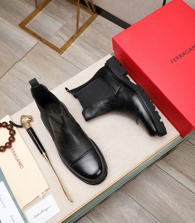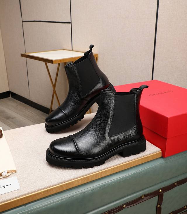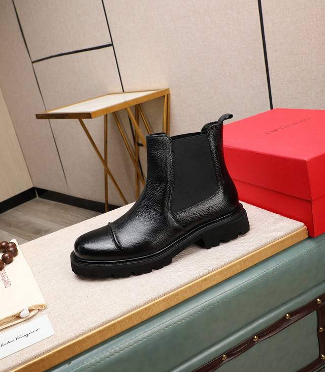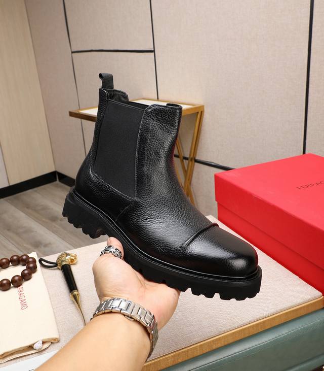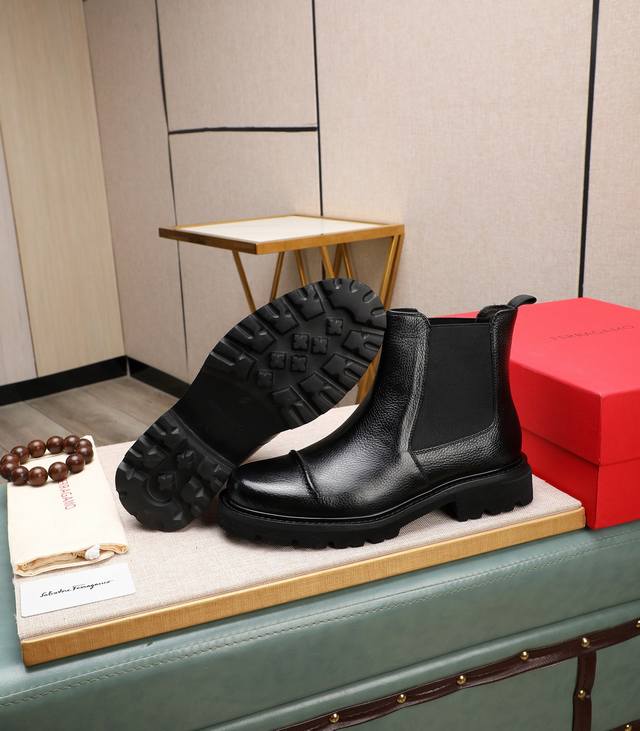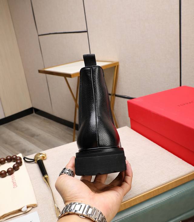 出厂价 顶级货Ferraga*菲拉格慕男士秋冬及踝靴,体现经典的优雅气质。高雅的外观搭配修长的版型,进口牛皮打造,舒适轻盈,套脚式穿脱方便,内里本染小牛皮,超轻