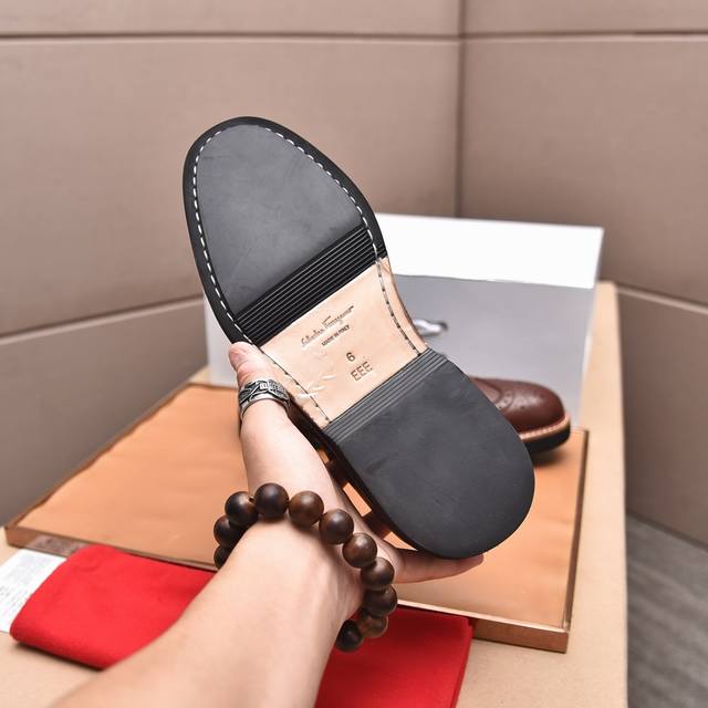 出厂价 高端货! 真皮大底 菲拉格慕 Salvatore Ferragamo 是国际顶级的鞋类奢侈品牌,来自时尚王国意大利,以传统手工设计和款式新颖誉满全球 专柜同步发售顶级西装鞋 此款采用纯手工制作 面料进口意大利小牛皮柔软水染牛皮内里 特供原版真皮大底尺码规格:3844