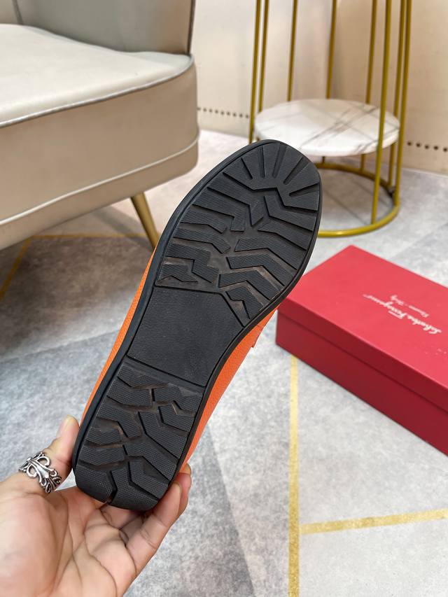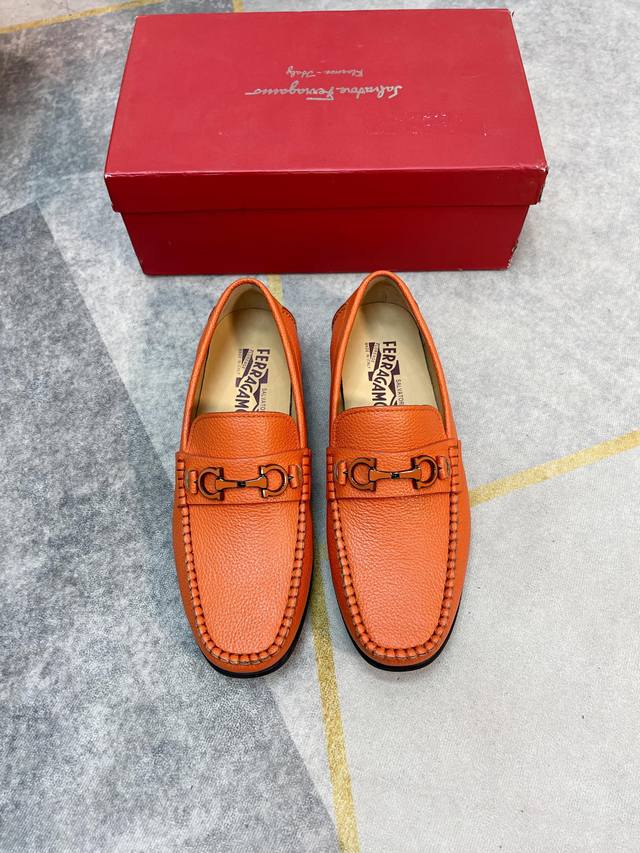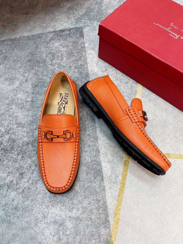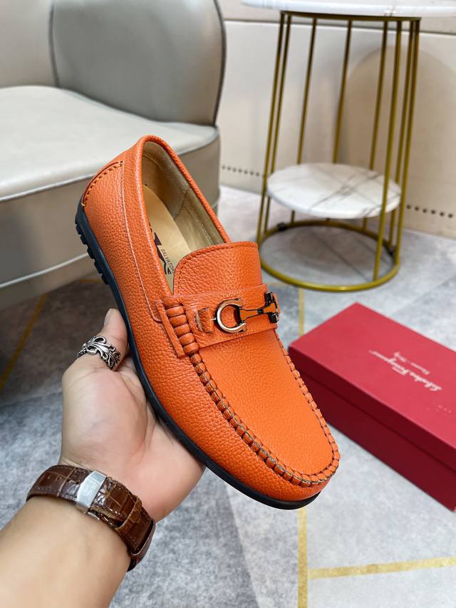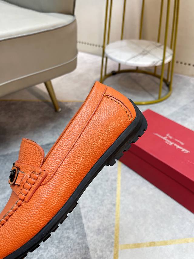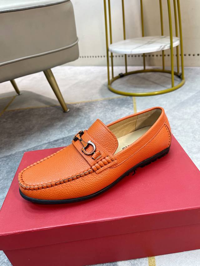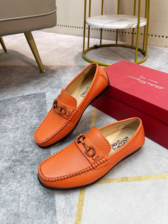 / 牛皮内里,精美包装 菲拉格慕休闲皮鞋,一脚蹬休闲豆豆鞋。鞋面进口优质荔枝纹牛皮,品牌金属扣装饰,奢华牛皮内里垫脚,完美鞋楦,时尚帅气,上脚舒服, 商务休闲两相宜