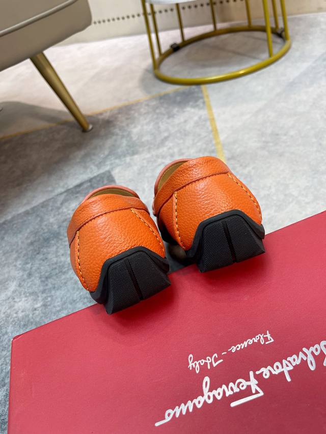牛皮内里,精美包装 菲拉格慕休闲皮鞋,一脚蹬休闲豆豆鞋。鞋面进口优质荔枝纹牛皮,品牌金属扣装饰,奢华牛皮内里垫脚,完美鞋楦,时尚帅气,上脚舒服, 商务休闲两相宜