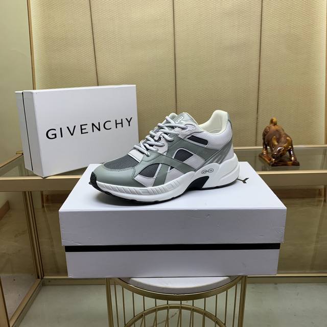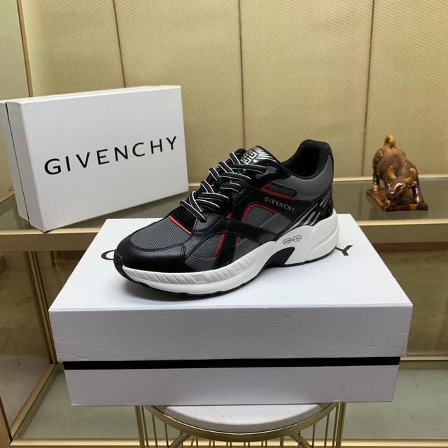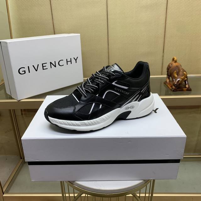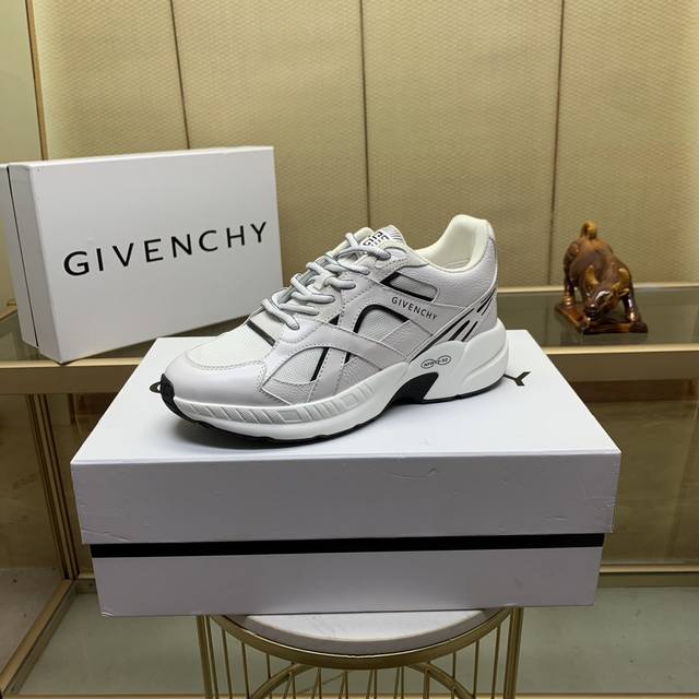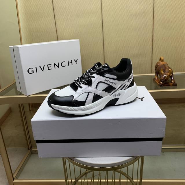 2024新款上市,纪梵希男士低帮慢跑运动鞋,轻型鞋底,鞋面高品质小牛皮制成!上脚效果帅气有型,增高4Cm,提升气场,鞋身图形刺绣,黑色撞色鞋带 透明黄色鞋底,饰有黑色加固、4G Logo标志和立体givenchy标志 码数38-44 45 定做