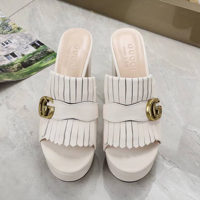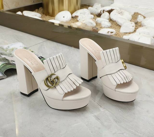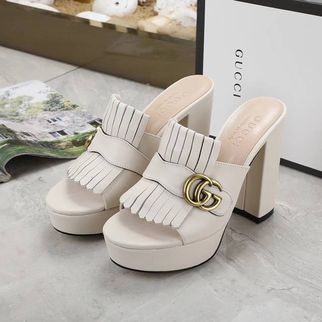上新款了:古奇高跟拖鞋出货了:3种面料:进口小牛皮:6个颜色、黑色牛皮、白色牛皮、咖啡色牛皮、米白牛皮、酒红牛皮绿色牛皮、2种颜色、金色水泡纹、银色