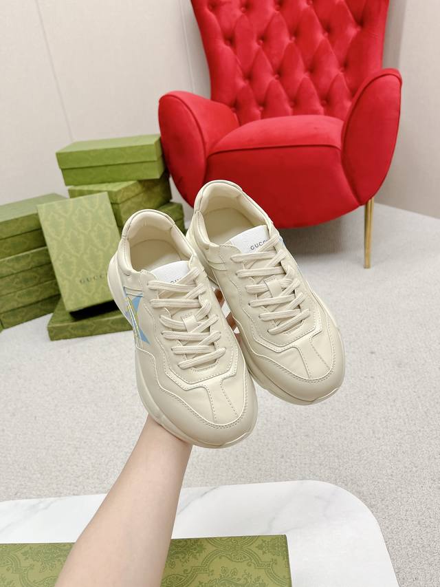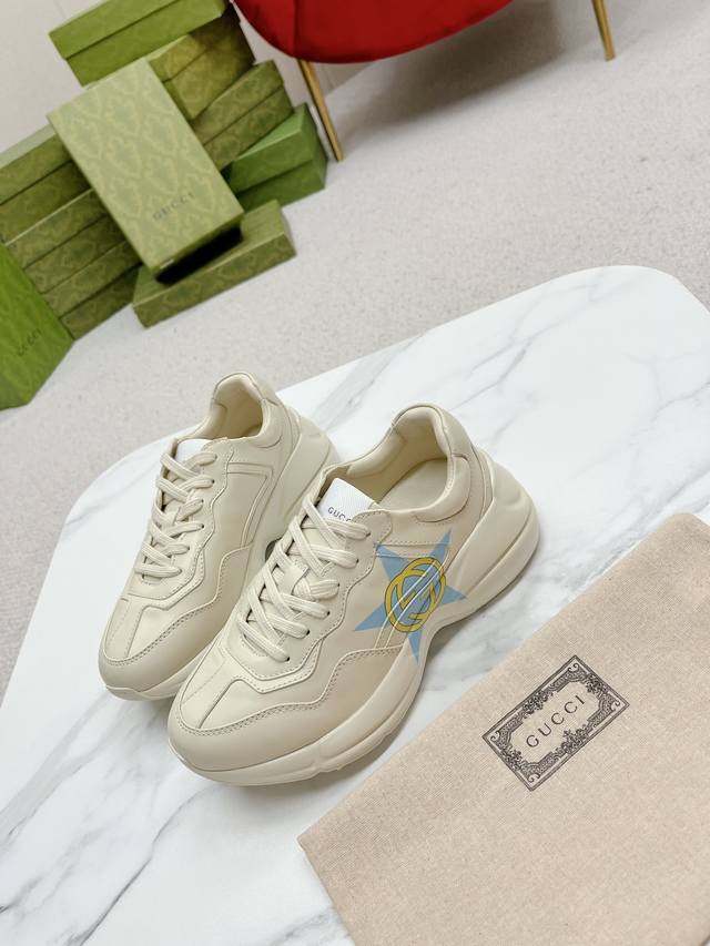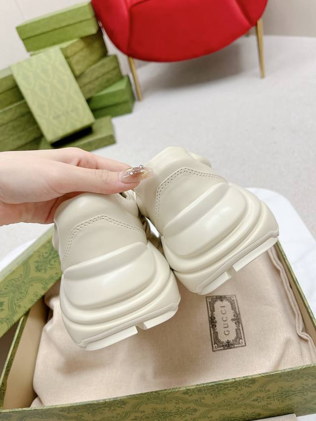 此款老爹鞋在今年仍然还是很受欢迎。对于爱美的人来说,鞋柜里不仅应该有一双白色的鞋子,还应该配有一双又帅又凹的老爹鞋!它的设计非常耐用,鞋底感觉非常柔软。穿在脚上既防滑又耐磨,而且用途广泛。为了显示自己的身高,老爹鞋子也是一个不错的选择。这款gucci是很好看的米白色,超级百搭。不挑衣服穿,也不挑包,随便搭。它穿上脚超级舒服,很软,还可以增高。