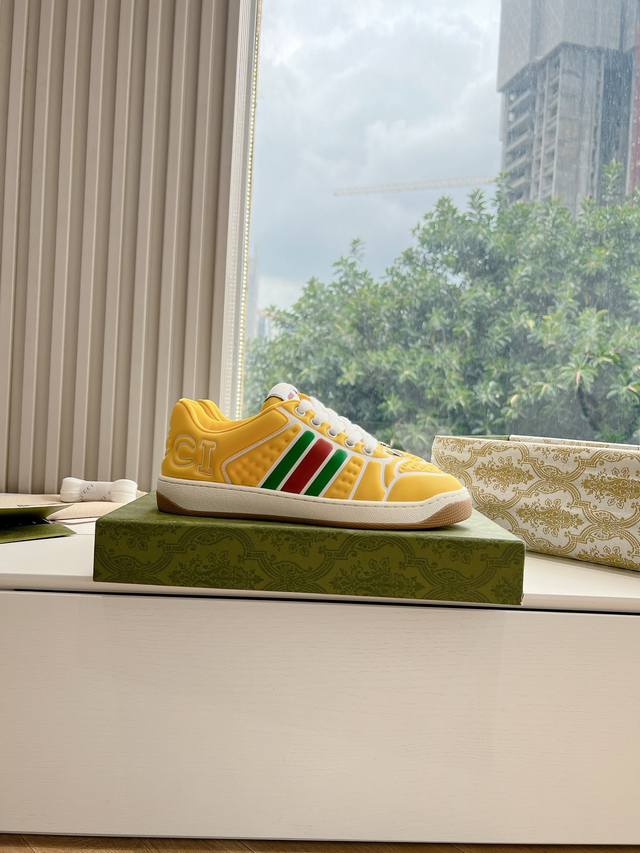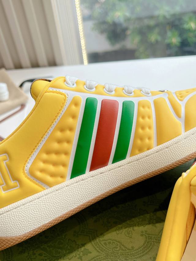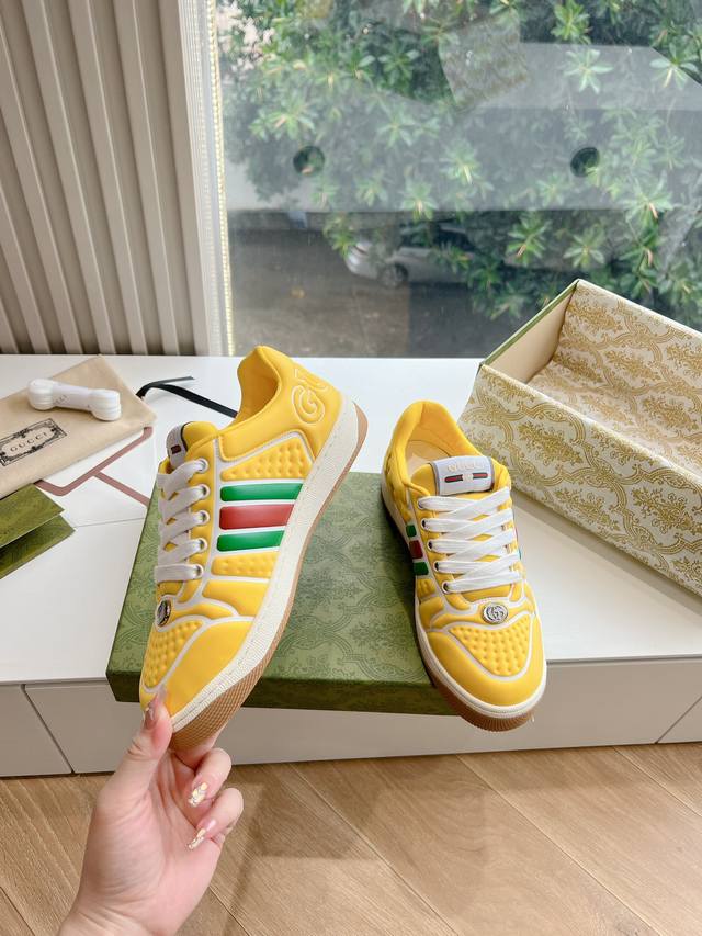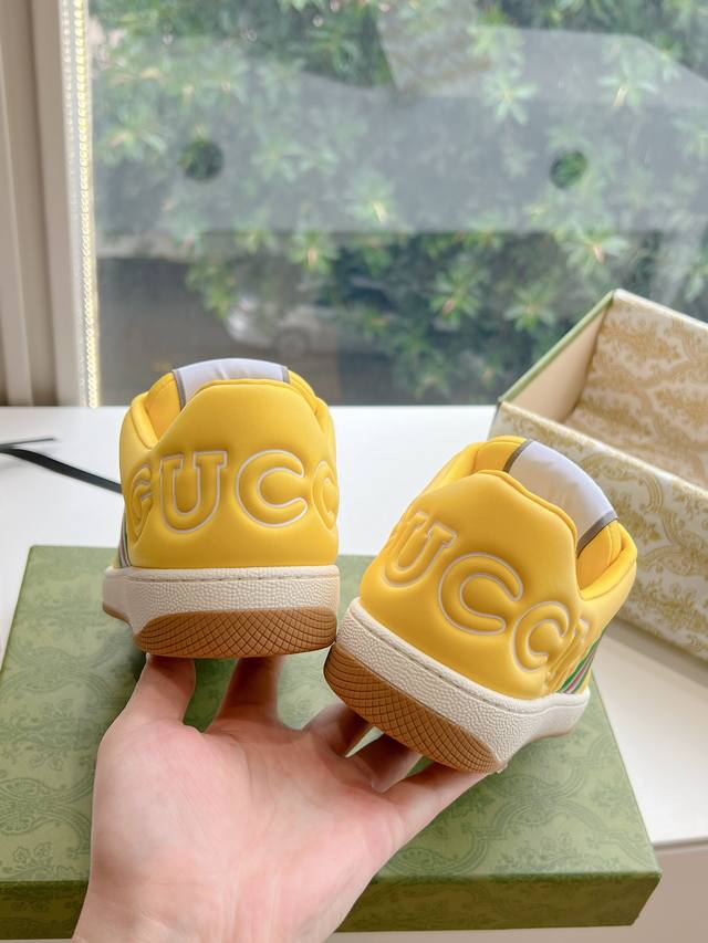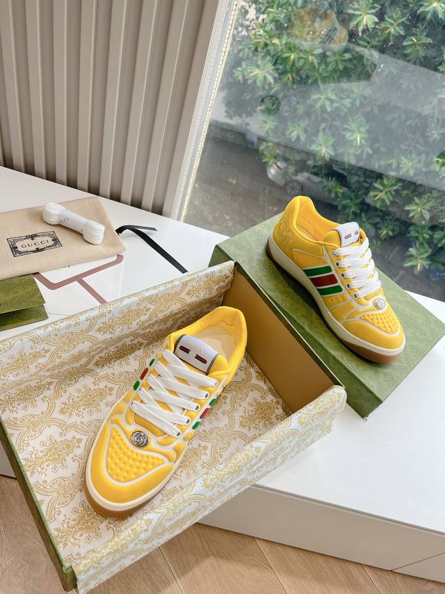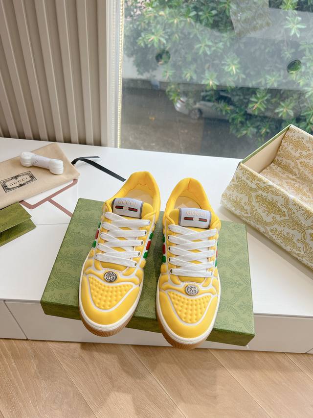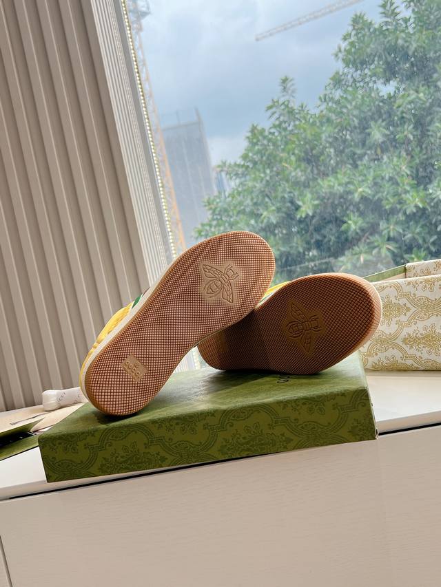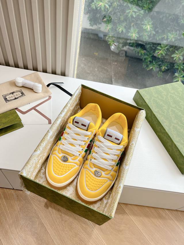 原版购入开发 做货 这一单品的设计从运动世界中汲取灵感,透过gucci视角焕新演绎,匠心融入醒目的品牌标识细节 这款流线型运动鞋以印花皮革匠心打造,饰有通体gg图案