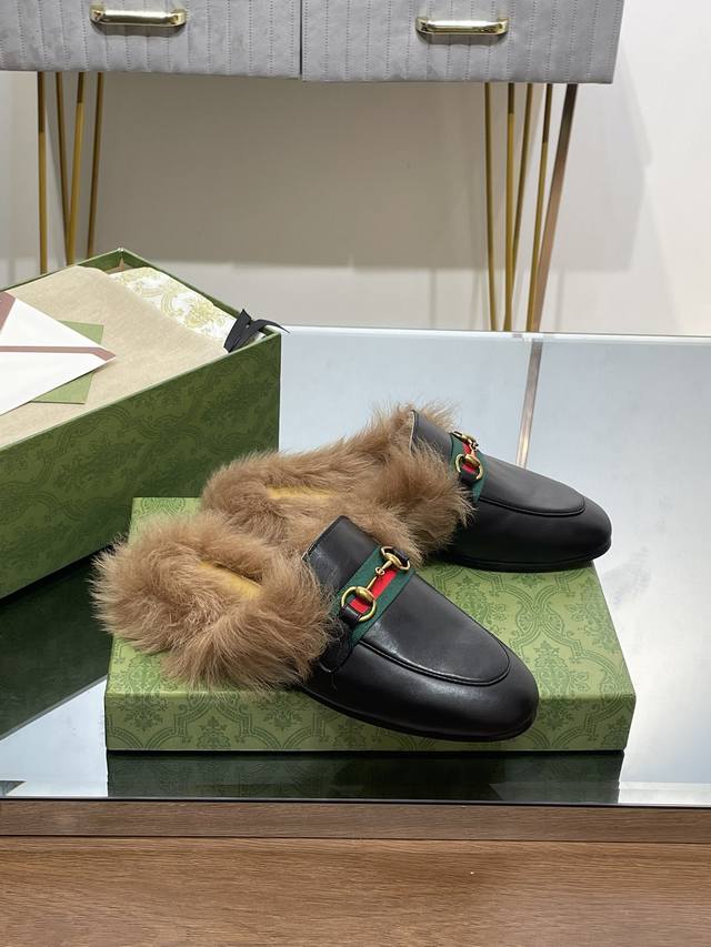 古奇万年经典 黑色小牛皮毛拖 Gucci高版本毛拖 原版1:1复刻开发 原版一致进口小牛皮 版型1:1复制 面料:进口西班牙小牛皮 内里 垫脚:牛皮100%进口