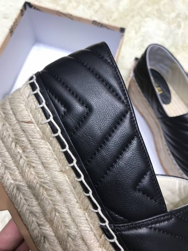 经典条纹logo,绗缝真皮徽标轻便草编麻底渔夫鞋。