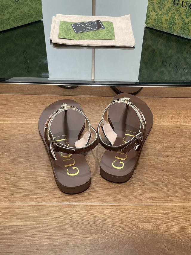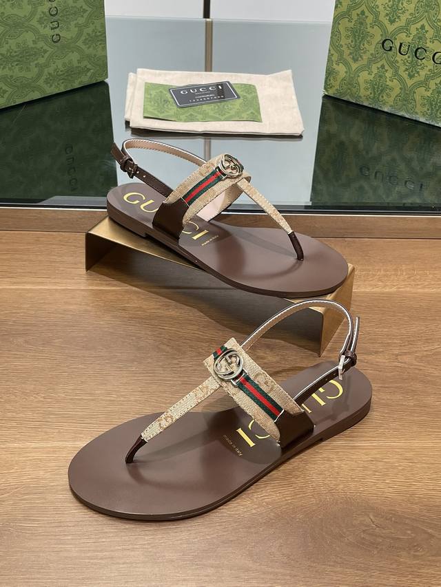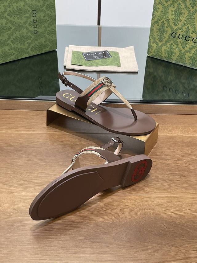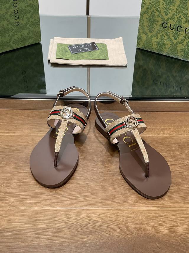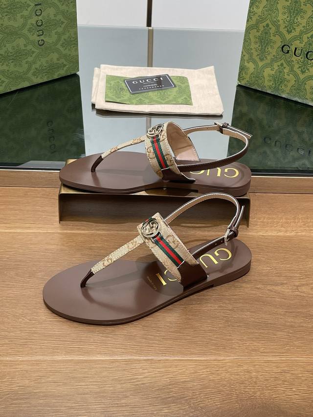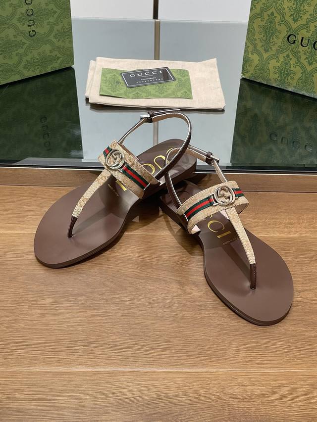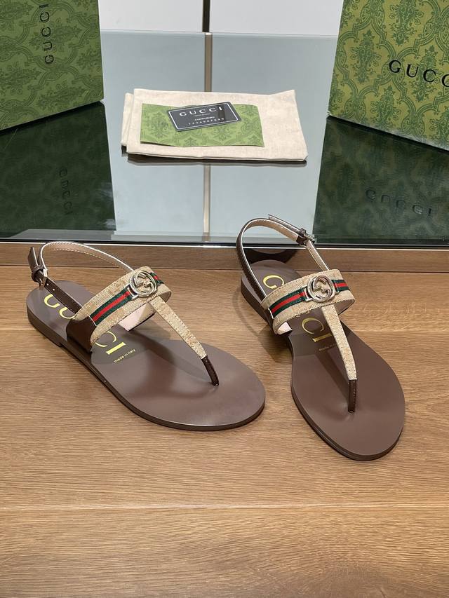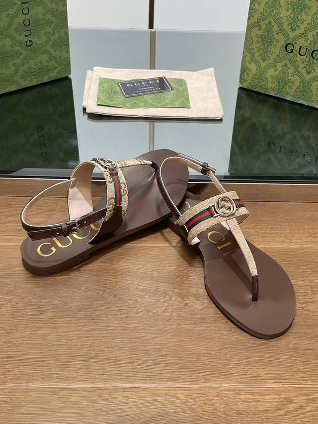 夏季最新人字情侣款凉鞋 互扣式双G扣夹脚夹趾凉鞋 G G老花布标志织带平底沙滩凉鞋