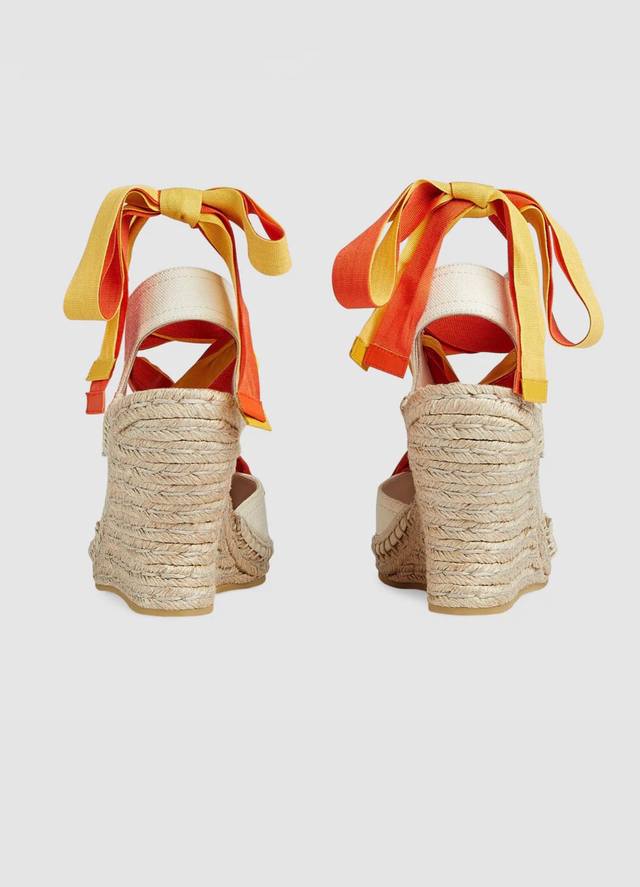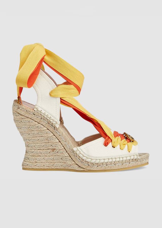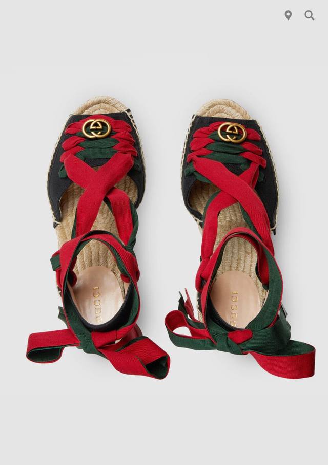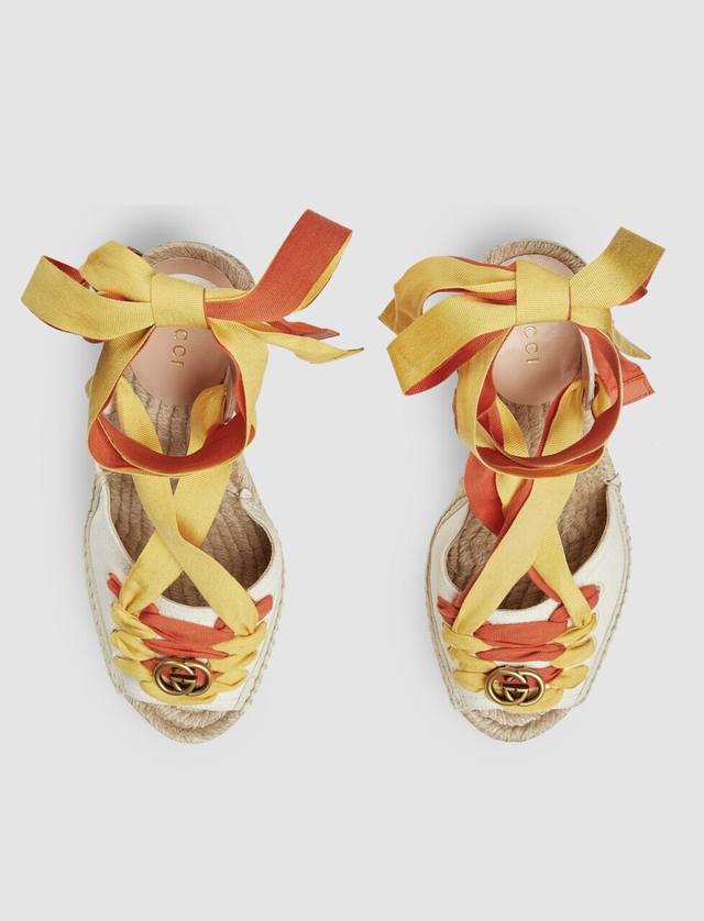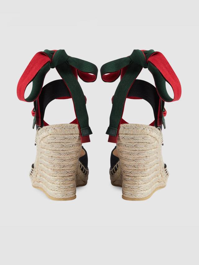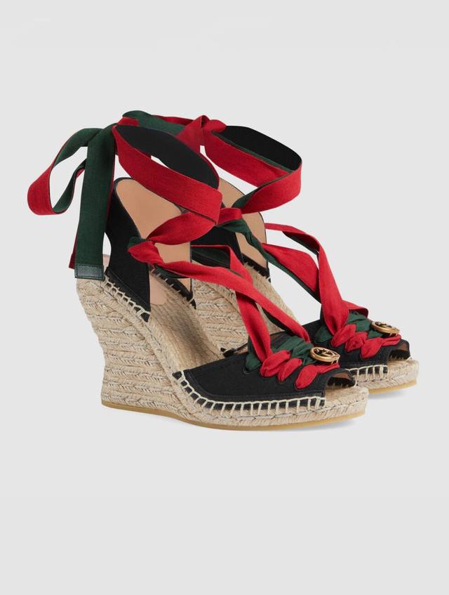 古奇 Gucci 这款草编坡跟鞋采用棉质帆布制成,搭配绳编防水台
