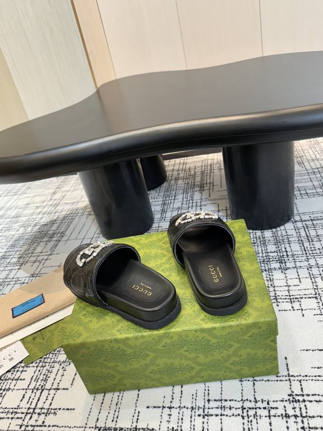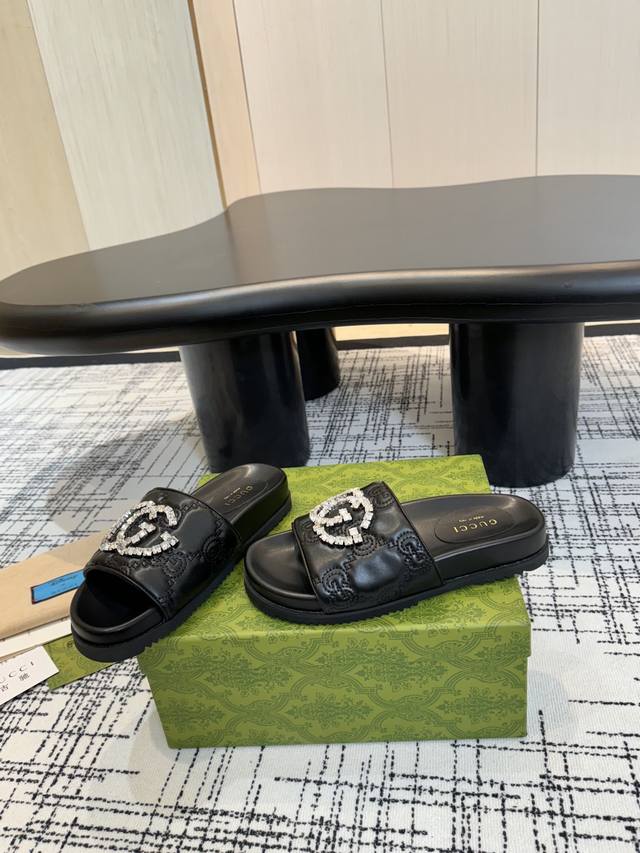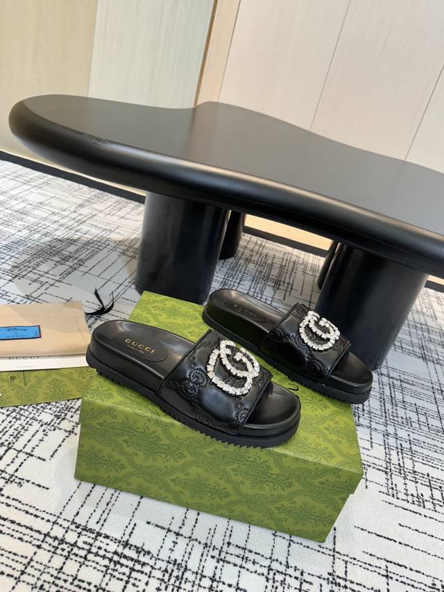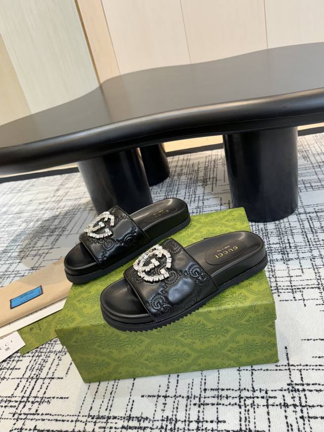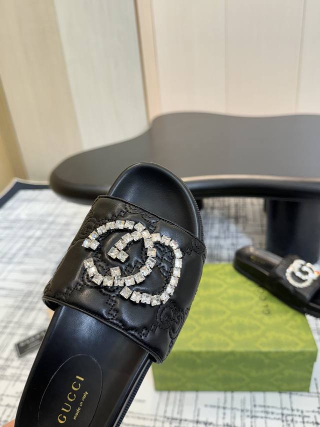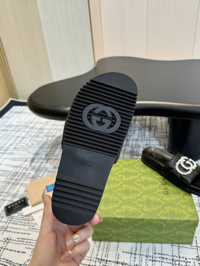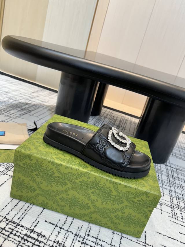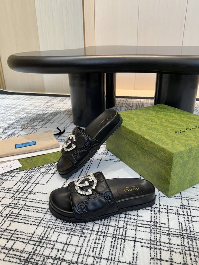 工厂P价 2025早春Gucci 双G彩钻扣拖鞋