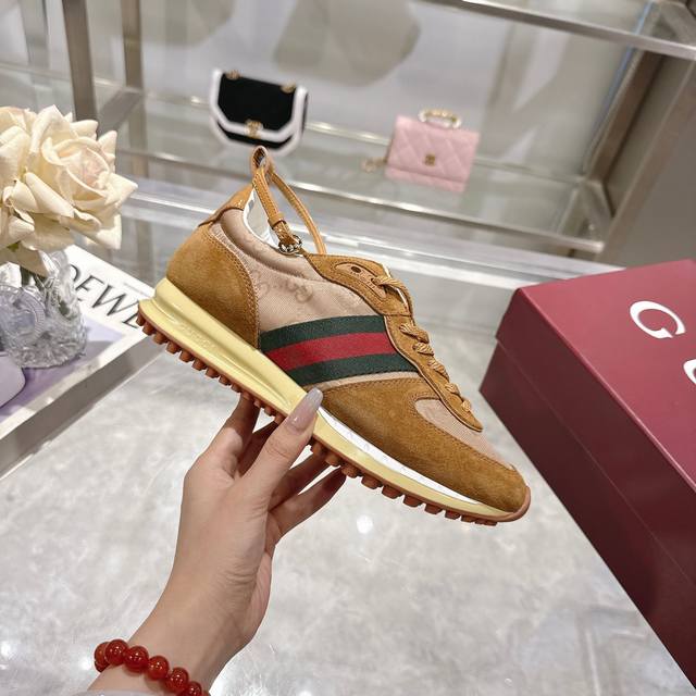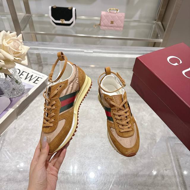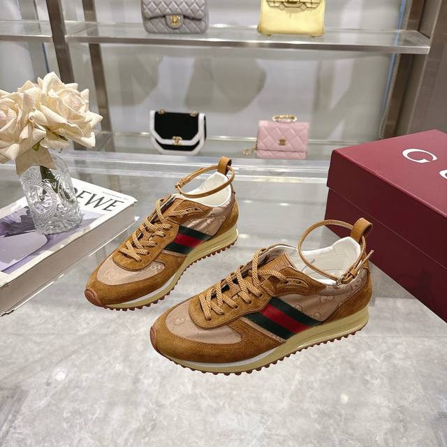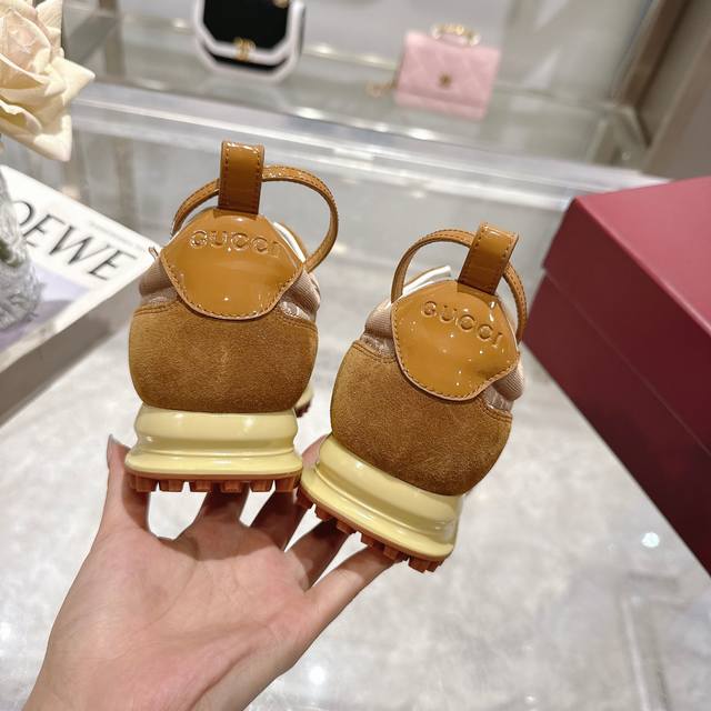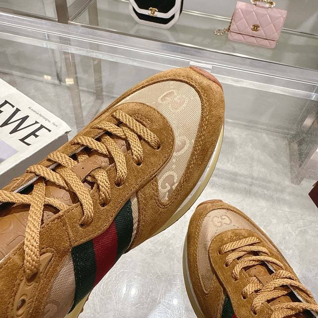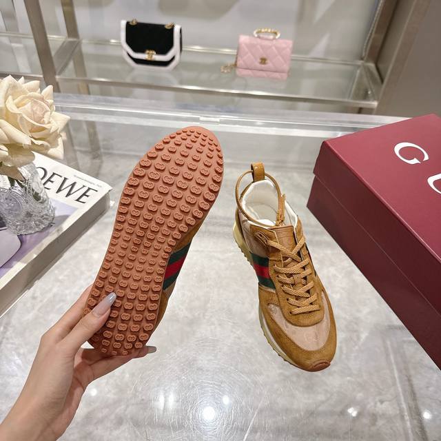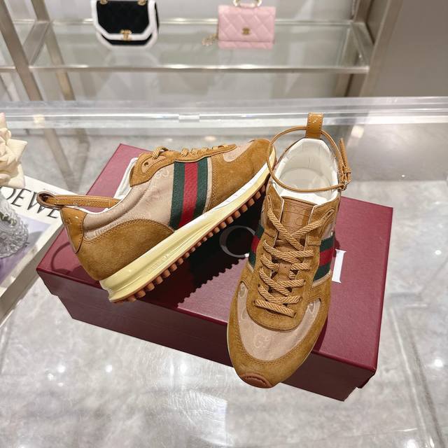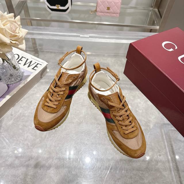 2025动感单品轻盈且灵活的外底经过特殊处理洋溢着浓郁的复古风情可拆卸可调节踝部绑带。鞋舌饰以高频压花工艺打造的3D立体Gucci字样标识织物衬里舒适透气超轻抽真空发泡鞋底,非常轻便35-40码,全套包装,驼红: ,可以做41码