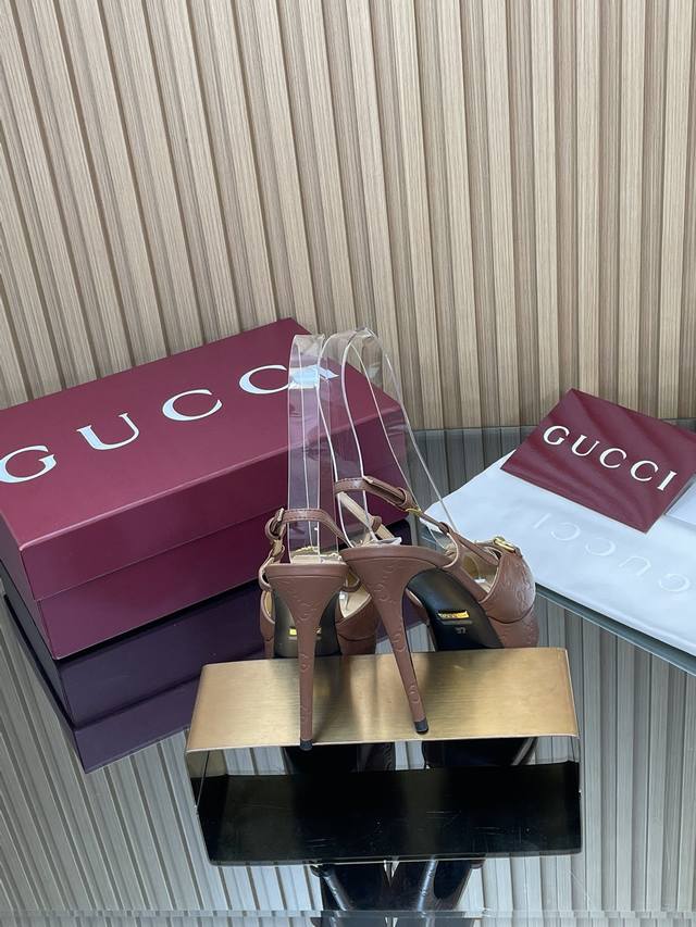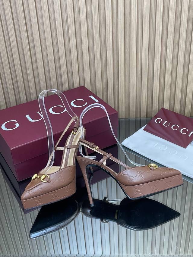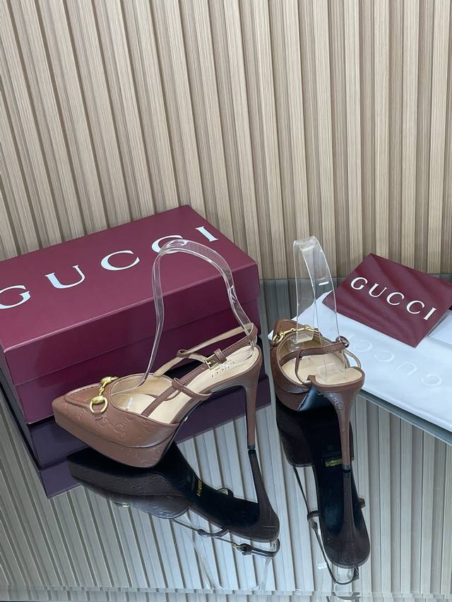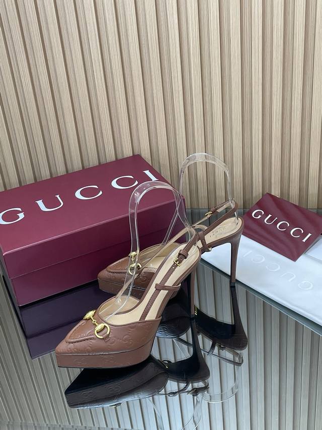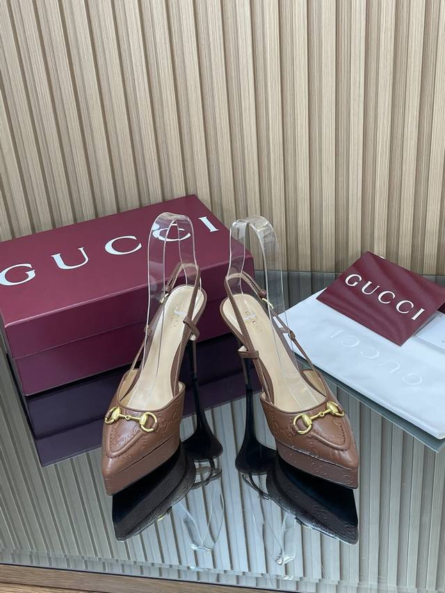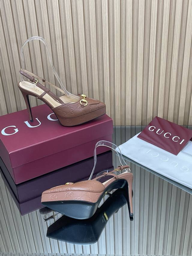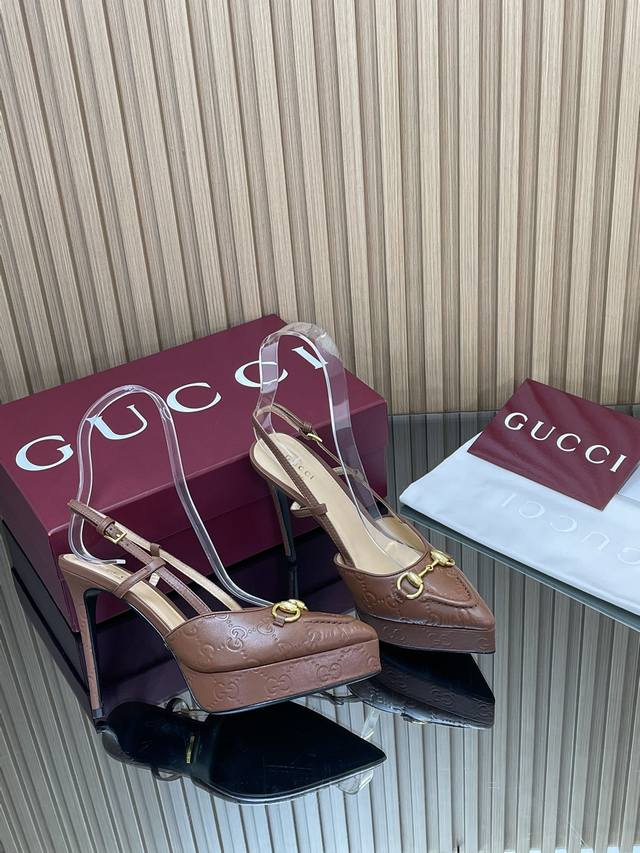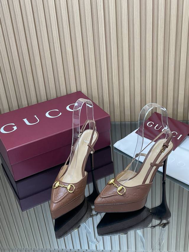 2025早秋G家新款 Gg压花皮 Gucc马衔扣露跟浅口细跟高跟尖头皮鞋恨天高防水台时尚后空鞋 出厂价p 顶级版本、欢迎比对. 原版1:1复刻 注意请认准咱家正