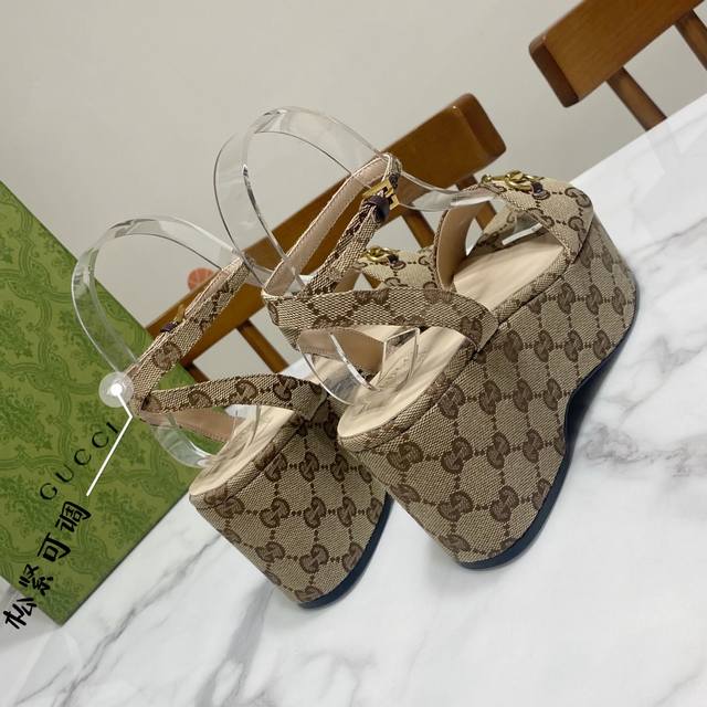 310 gucci 古奇 坡跟水台凉鞋,恨天高系列,妥妥的欧美风 鞋面牛皮/布,里垫为羊皮,橡筋底 前掌:5Cm,后跟:8.5Cm 码数:35-39(40.41