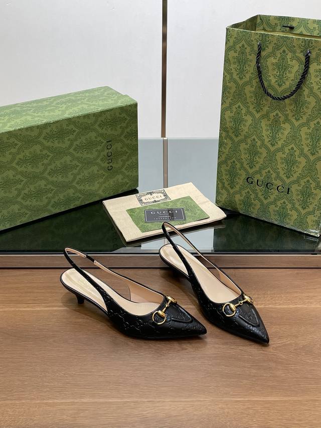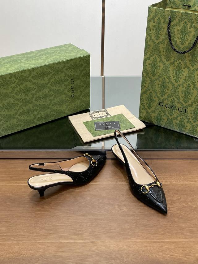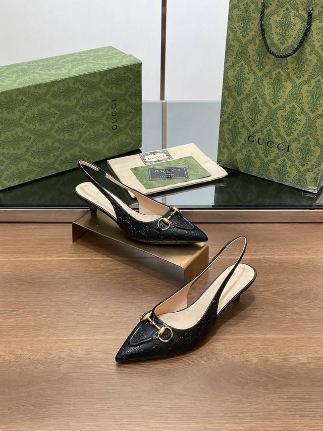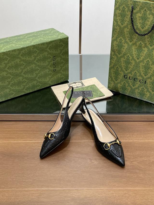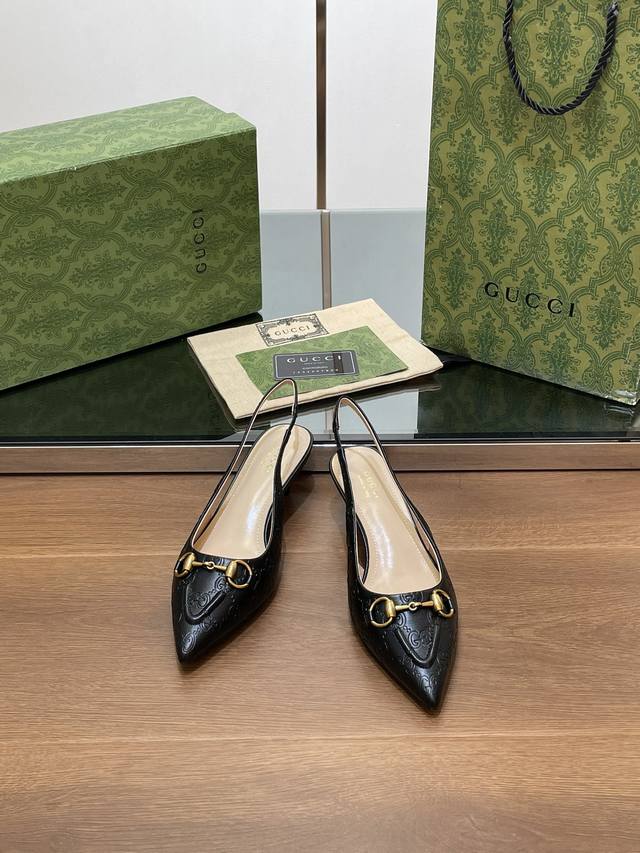 G家新款 Gg压花皮 Gucc马衔扣露跟浅口细跟高跟尖头凉鞋猫跟鞋新配色