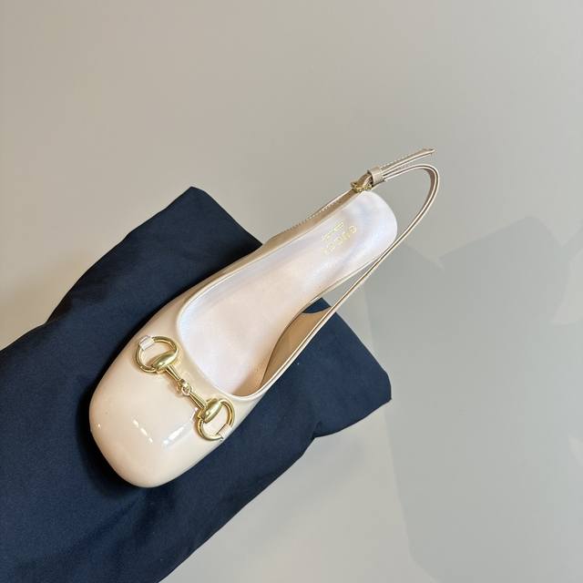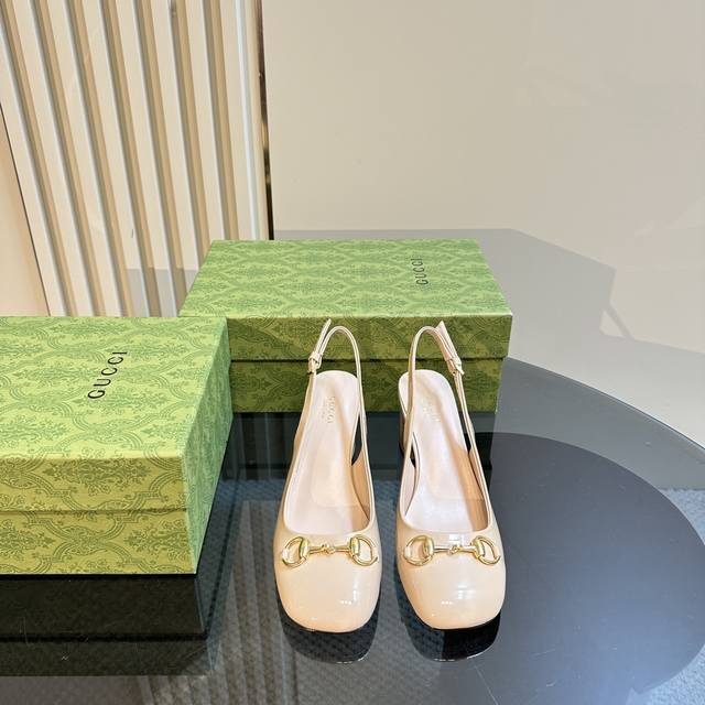 G家早秋新款 Gucc马衔扣露跟浅口后系带凉鞋粗跟漆皮凉鞋,这款浅口鞋甄选进口软漆皮打造,匠心融蕴经典马绗扣造型配件,圆头和可调节脚踝搭扣设计相得益彰,演译学院