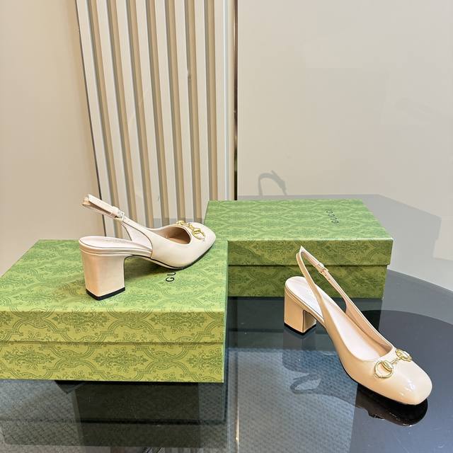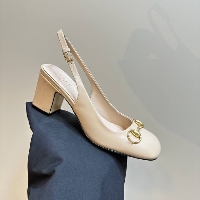 Gucc马衔扣露跟浅口后系带凉鞋粗跟漆皮凉鞋,这款浅口鞋甄选进口软漆皮打造,匠心融蕴经典马绗扣造型配件,圆头和可调节脚踝搭扣设计相得益彰,演译学院风格鞋面:进口高档软漆皮