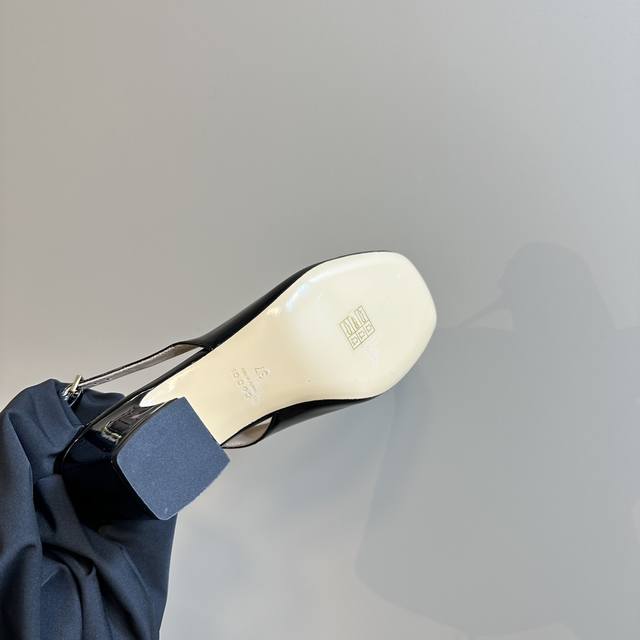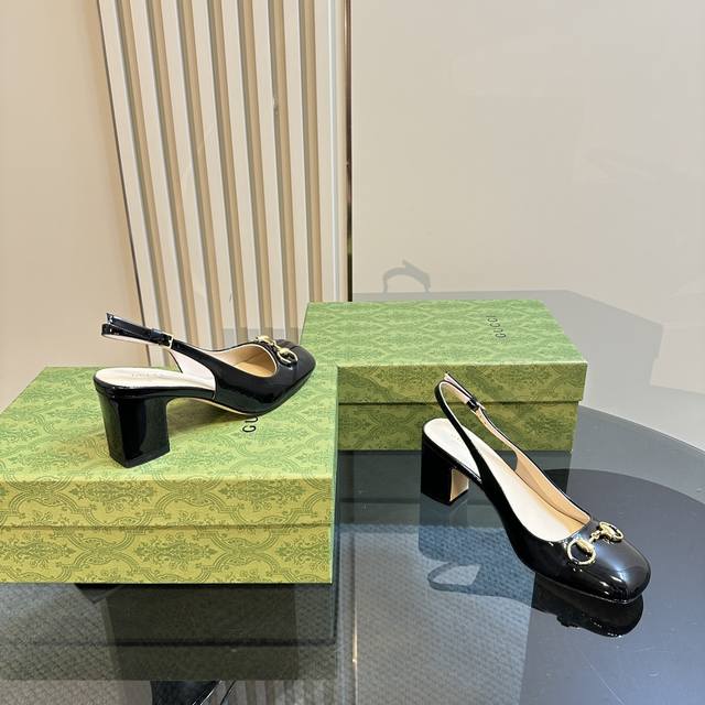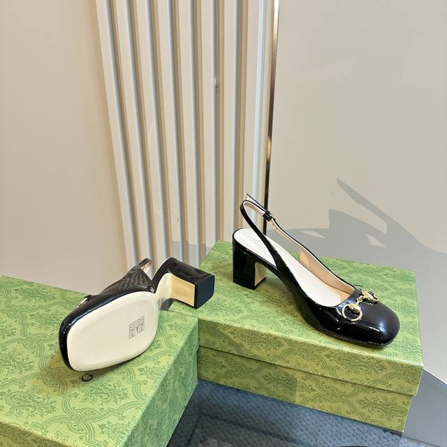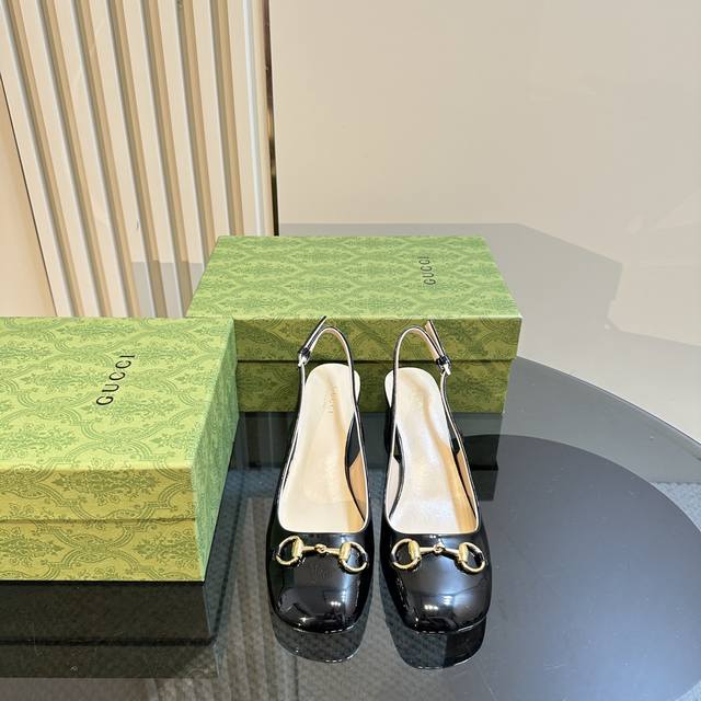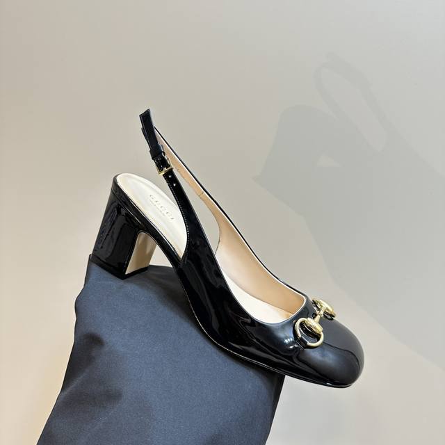 Gucc马衔扣露跟浅口后系带凉鞋粗跟漆皮凉鞋,这款浅口鞋甄选进口软漆皮打造,匠心融蕴经典马绗扣造型配件,圆头和可调节脚踝搭扣设计相得益彰,演译学院风格鞋面:进口高档软漆皮