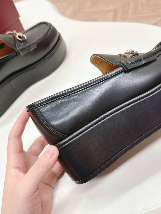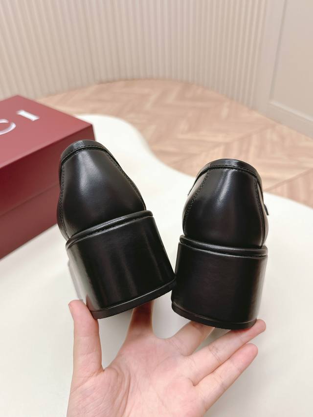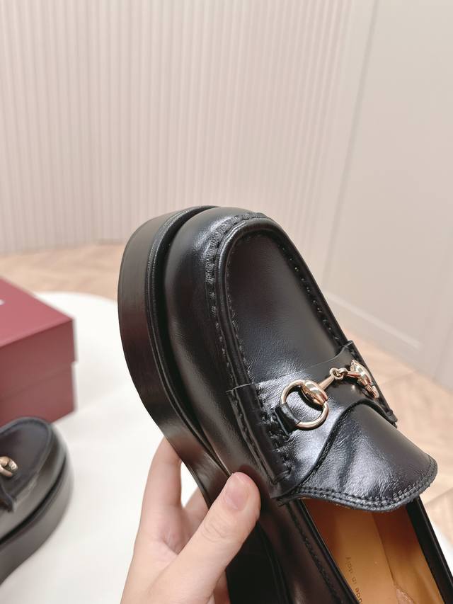原版购入开发 做货 品牌经典元素为这款精致的马衔扣乐福鞋注入隽永格调。光面皮革与浅金色调配件相得益彰。坡跟细节为经典款式注入个性新意