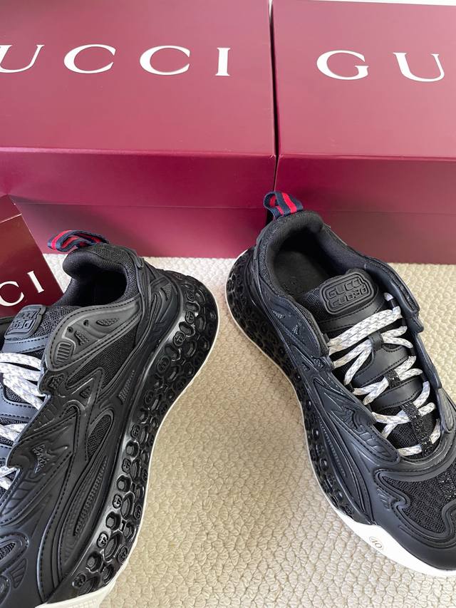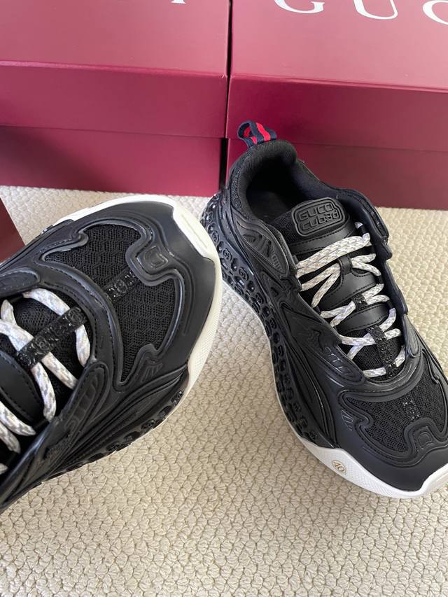 2025春夏系列精彩呈献鞋履新作。这款Gucci Cub3D系列运动鞋巧妙结合了创新材质与精致构型。鞋面采用可持续材料Demetra与网眼面料,细节之处经由高频工艺匠心呈现。鞋底内部填充 Eva材料,外部采用Tpu打造,最后以3D效果互扣式双G图案点睛,为款型平添风采。