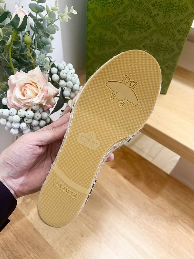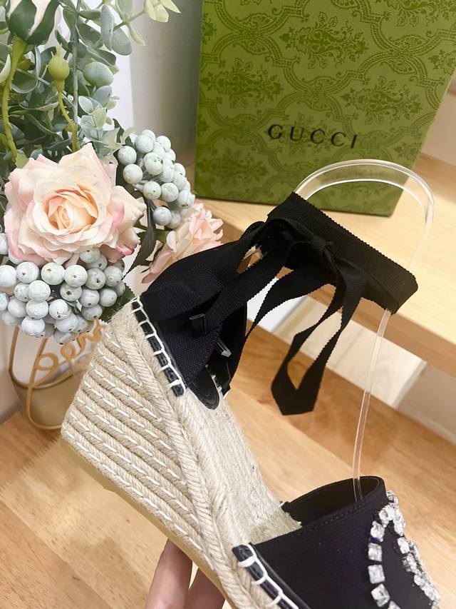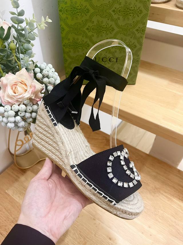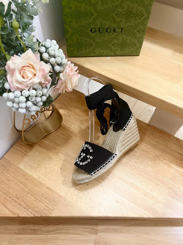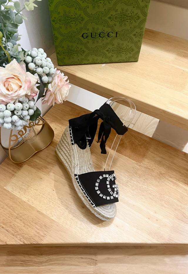 Gucci 古奇 25Ss 早春水钻gg字母图案装饰园头古奇草编新款坡跟渔夫鞋