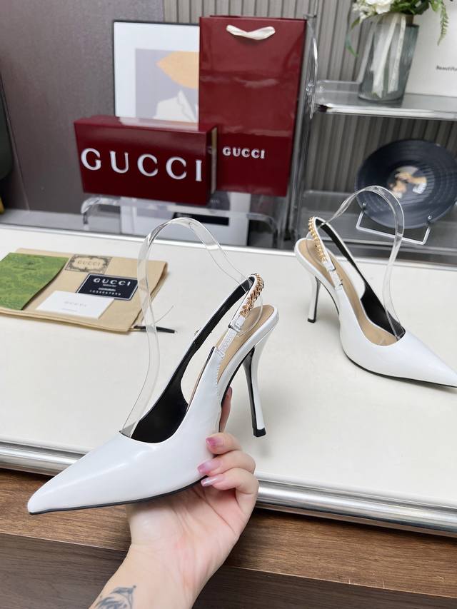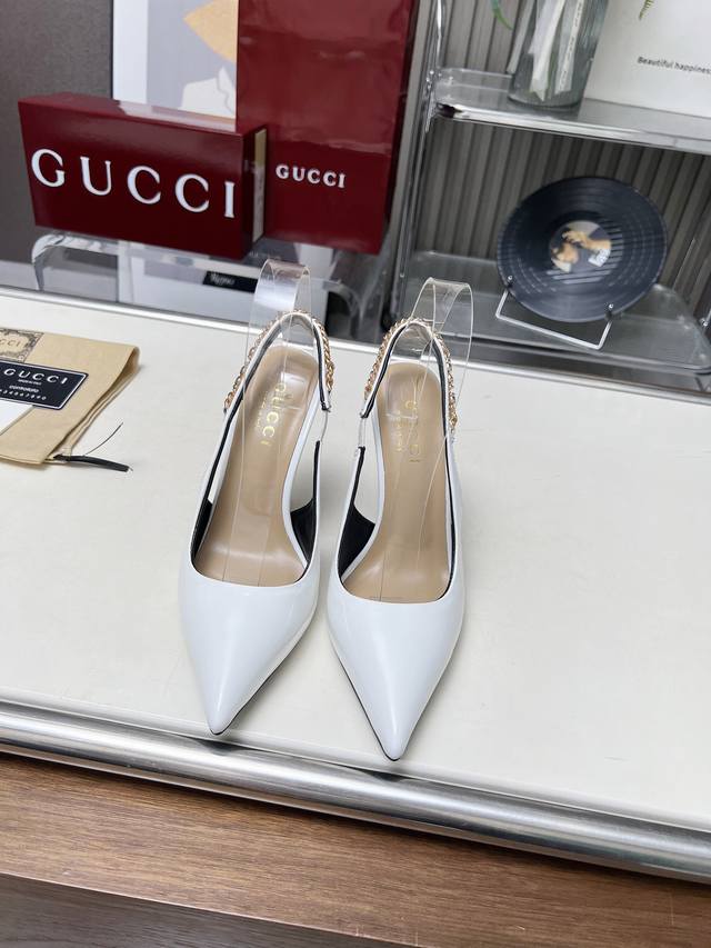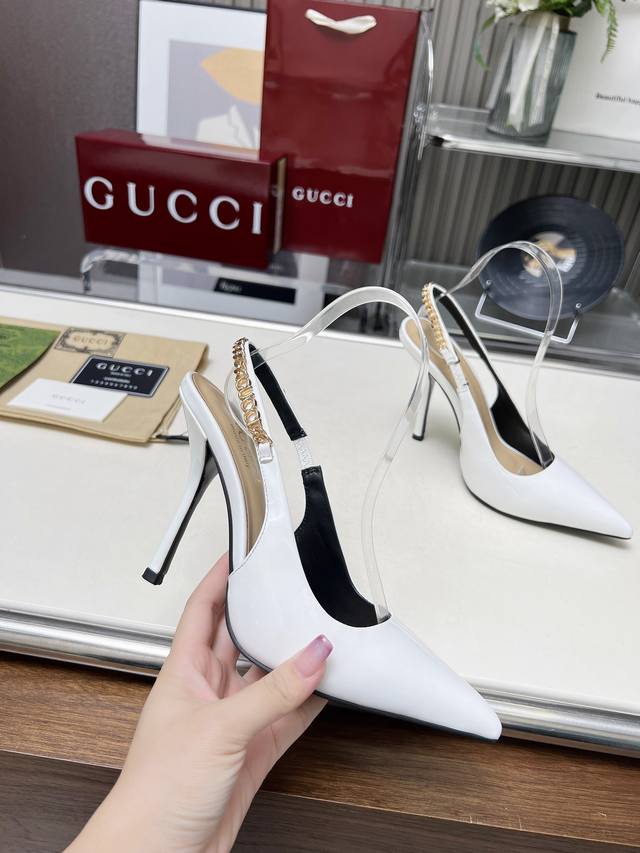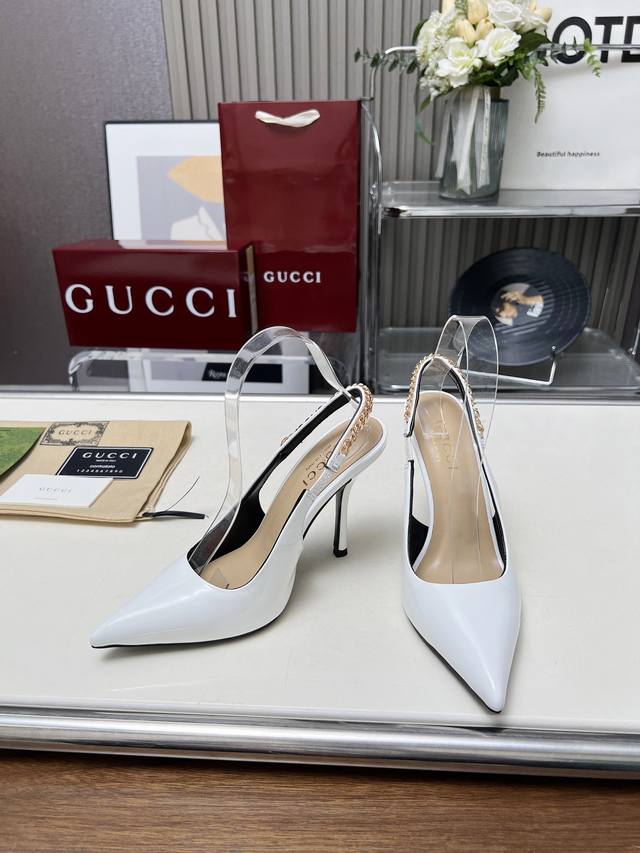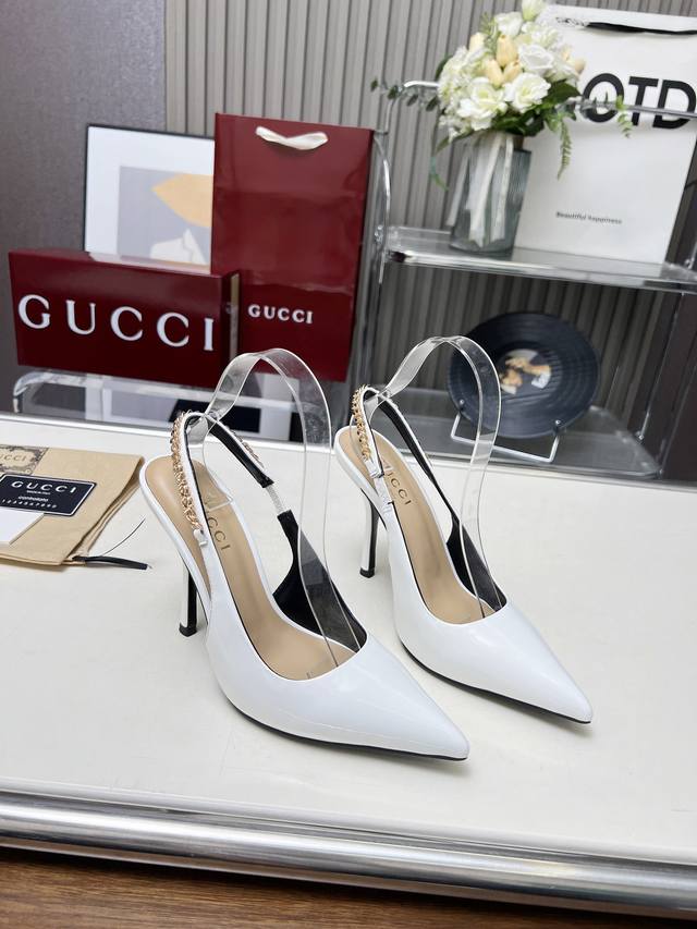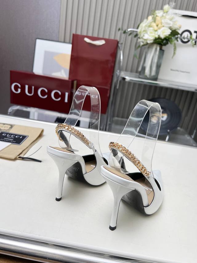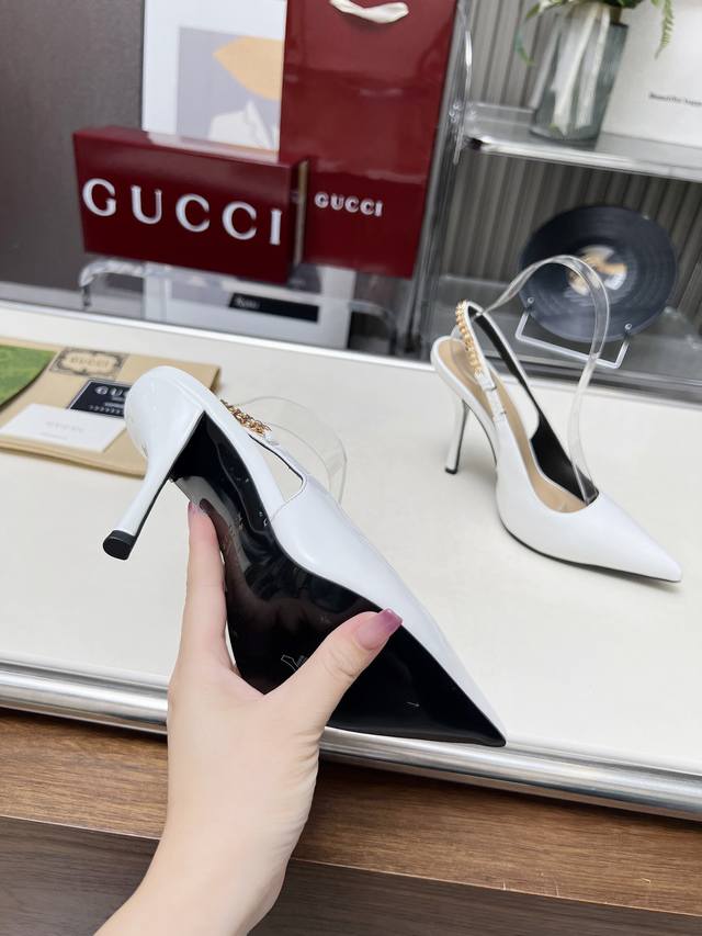 gucci 古驰 新款原版复刻金属字母链条浅口尖头高跟鞋漆皮单鞋,面牛漆皮 内里垫脚羊皮,35-42码 橡胶底 皮底