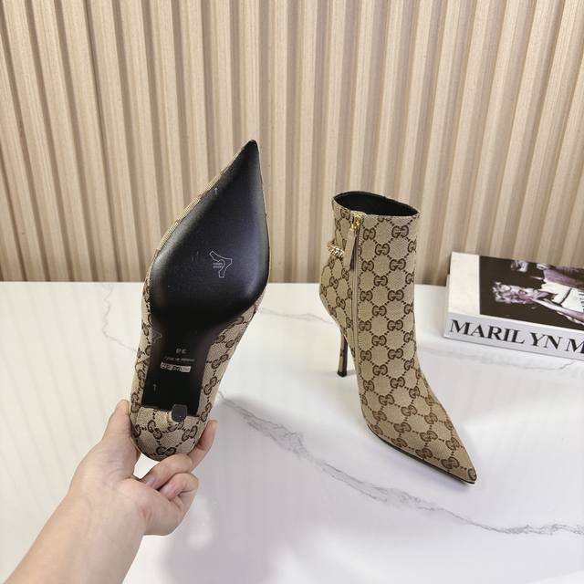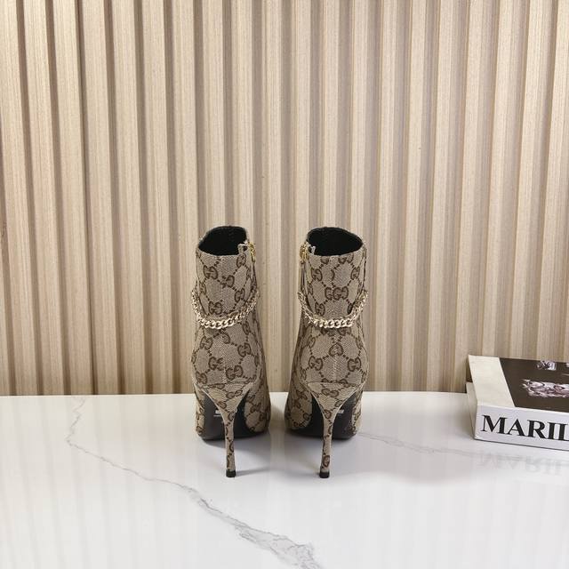 Gucci 经典爆款秋冬尖头链条高跟短靴!今年最不能错过的一双靴子!整体楦型流畅秀气,精致百搭又不失时髦感谁还没有冲5码数: 35-39 40 41 42定做