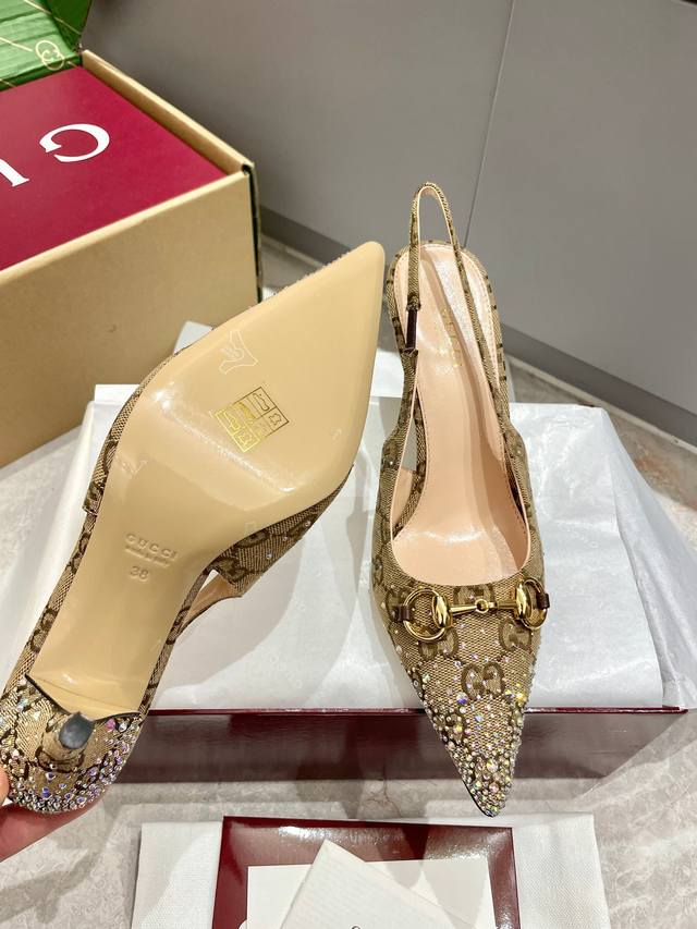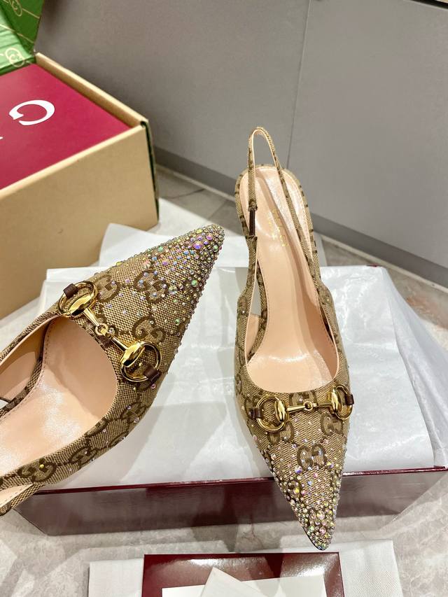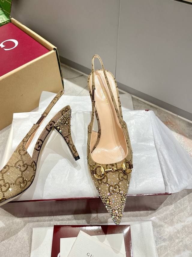 Gucci 2025春夏季新品 手钻浅口鞋烫钻新款奢华马衔扣烫钻高跟鞋魅力尖头后空原版双G布高级质感细高跟慕勒鞋原汁原味原单品质每个细节皆经过精心细致打造,可与Zg对比一,无二品质!