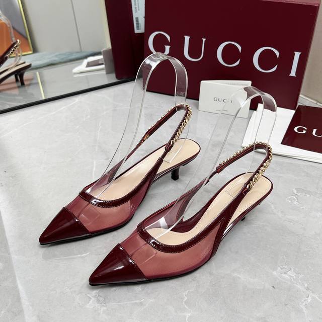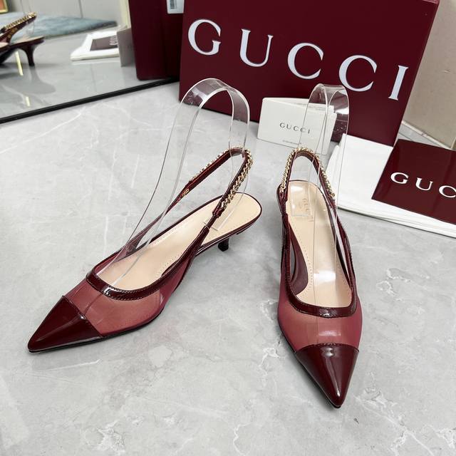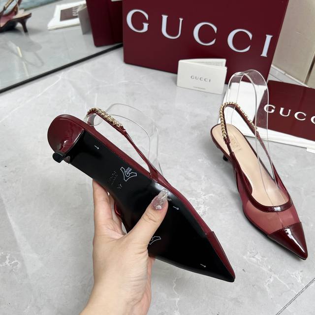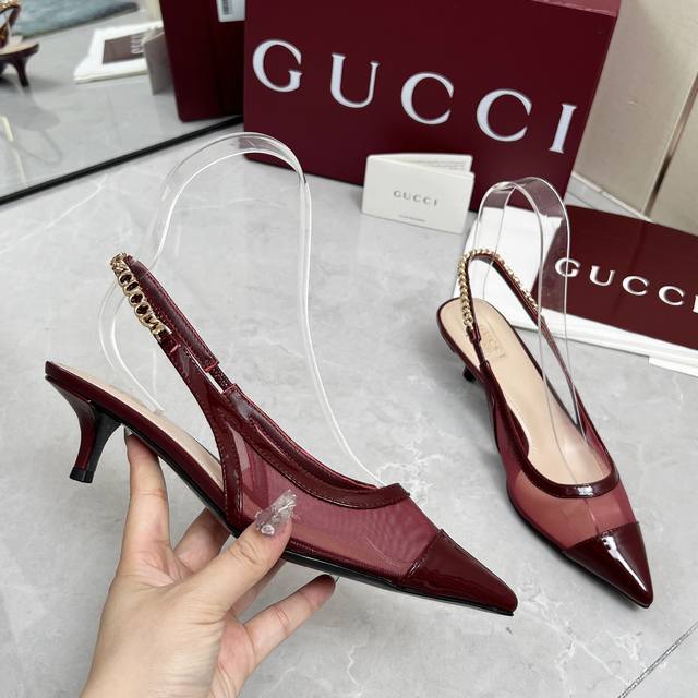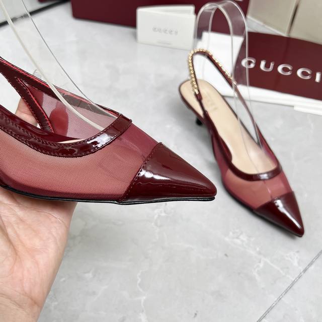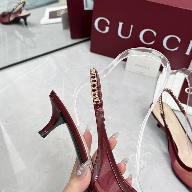 p380 Gucci/古驰 25链条高跟凉鞋 面料:网纱+漆皮 内里:羊皮 大底:意大利真皮大底 跟高:4.5Cm/10.5Cm 码数:35-42