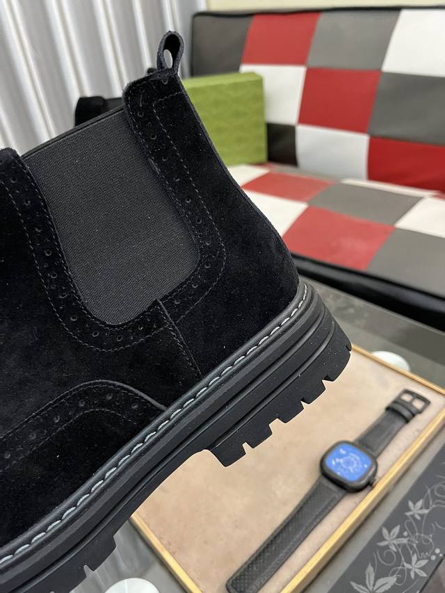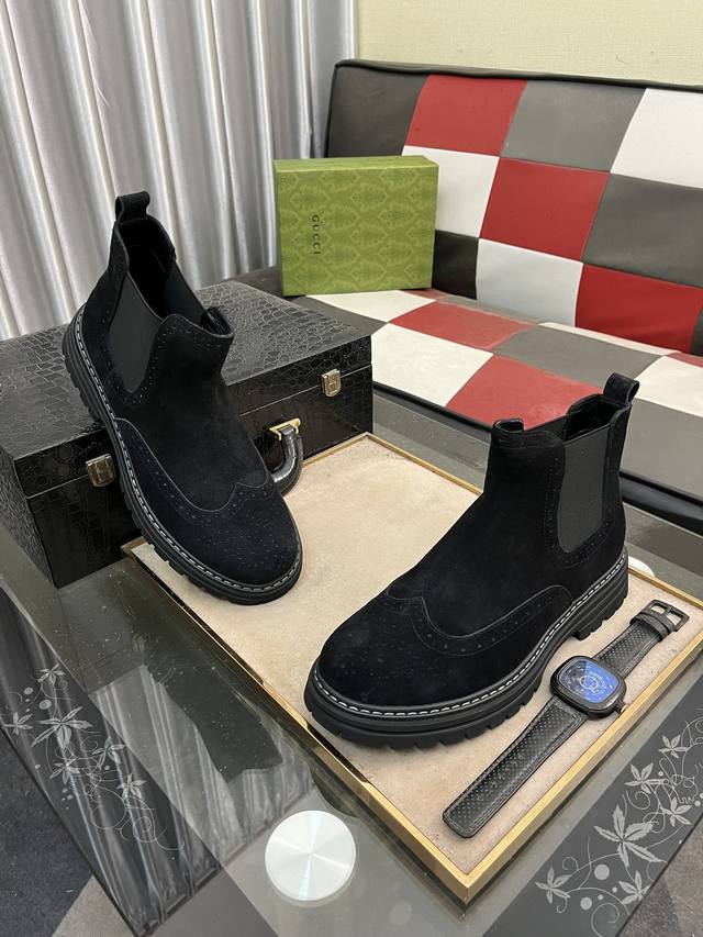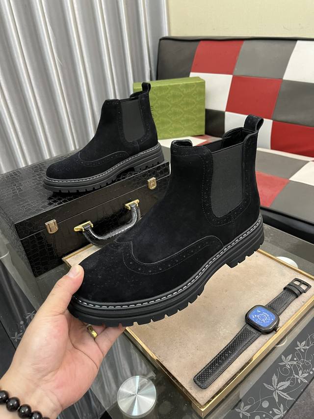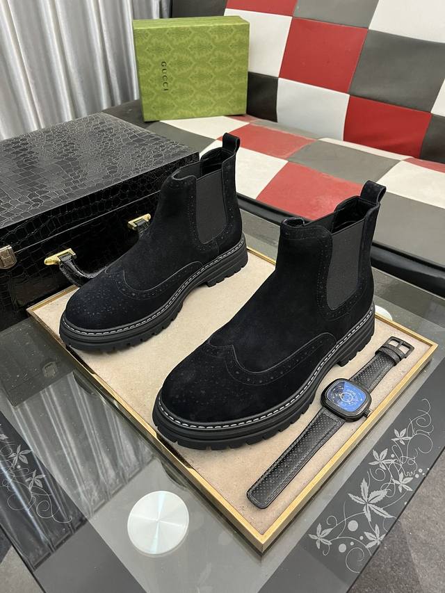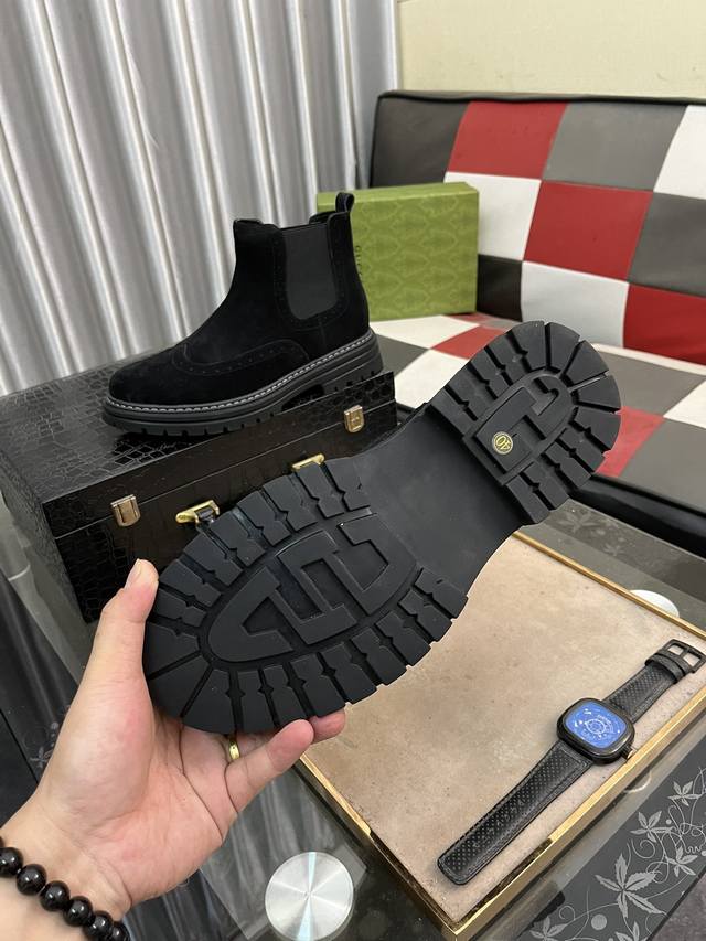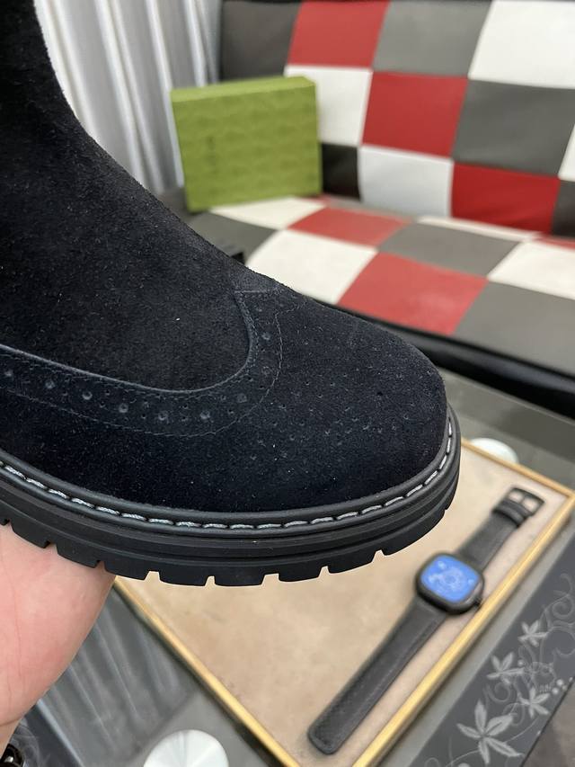 出厂价: 商品商标:Gucc* 古奇* 高帮靴子 正码码数: 38-44 可订做45.46 商品材料:鞋面进口磨砂皮,牛皮内里,原版大底。