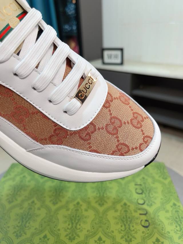 GUCCI最新款~~这款运动鞋采用客供织物面料制成,两侧饰有经典G家红绿条纹织带,鞋带饰金属双G椭圆形珐琅细节,鞋跟缀饰Gucc...