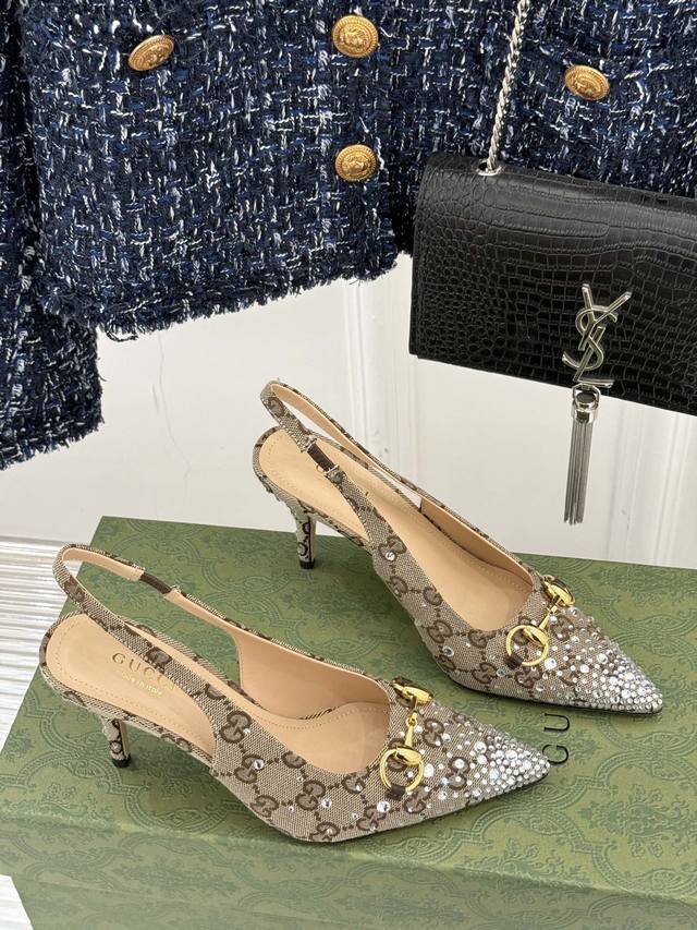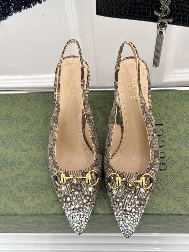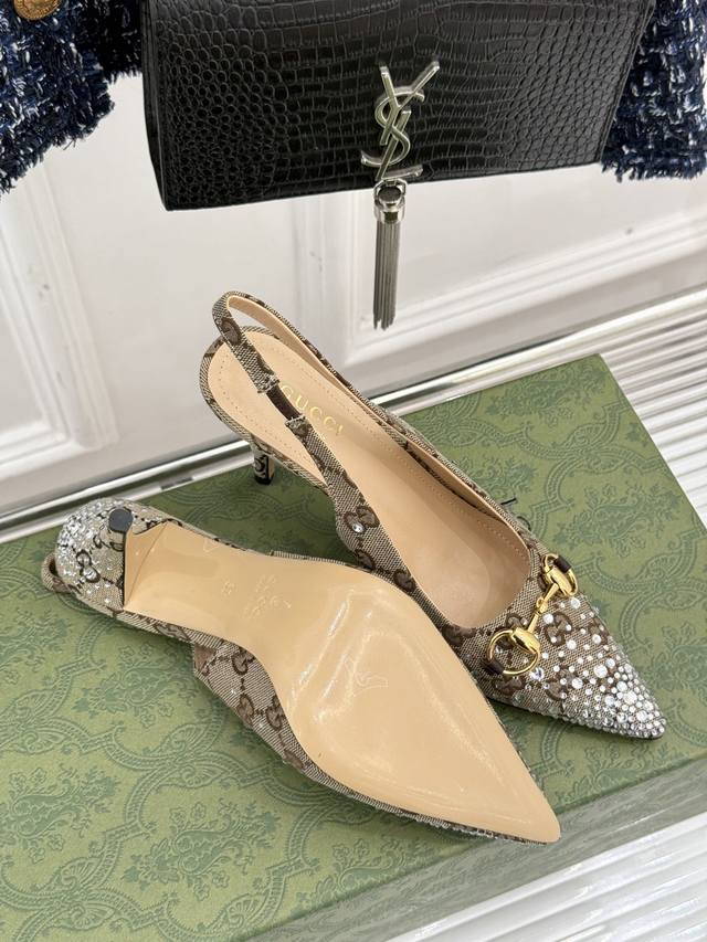 Gucc*经典马衔扣尖头后空高跟凉鞋