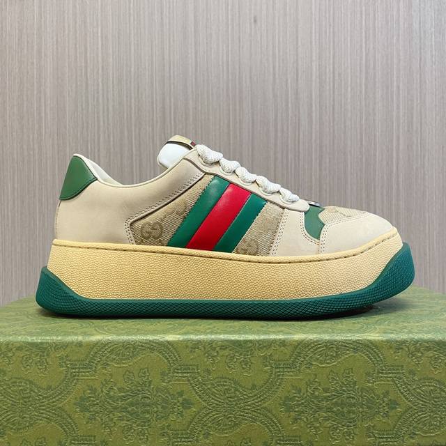 / 实价 Gucci 2024最新情侣款胖嘟嘟小脏鞋~~厚底鞋~~休闲鞋~~运动鞋~~鞋面牛皮拼接经典双g布面料,头层牛皮内里,垫脚乳胶注塑一体,私模6Cm厚tpu