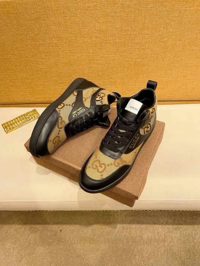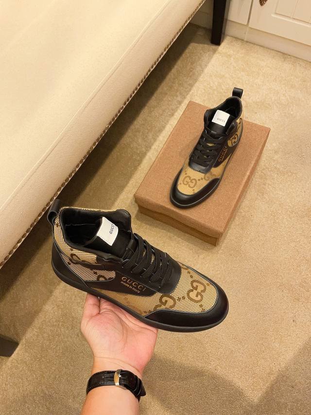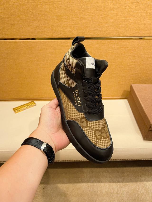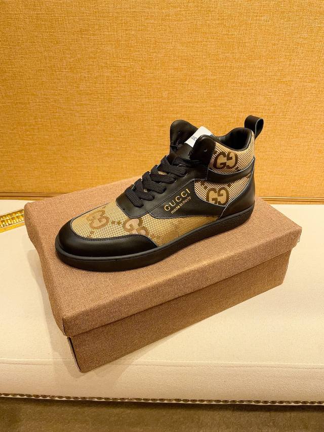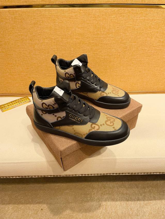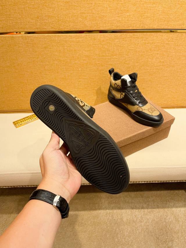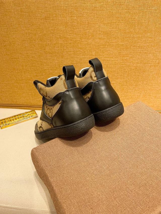 工厂价 。 高帮 G U C C l 古奇顶级新款专柜同步发售,鞋面意大利进口头层牛皮。全进口真皮内里,完全1比1复刻,鞋底:原厂特供原版底,独家活动成型底超级舒适,原厂跟单货,高品质,可随意进出专柜,欢迎对比。码数:38-44