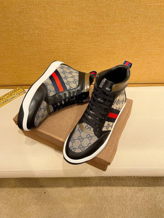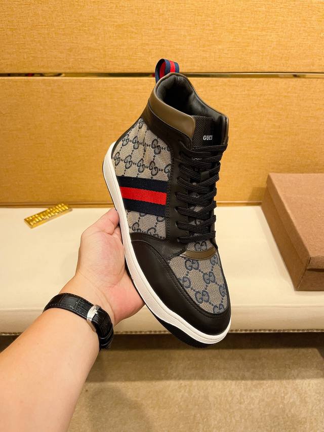 工厂价 。 高帮 GUCCI 古奇顶级新款专柜同步发售,鞋面意大利进口头层牛皮。全进口真皮内里,完全1比1复刻,鞋底:原厂特供原版底,独家活动成型底超级舒适,原厂跟单货,高品质,可随意进出专柜,欢迎对比。码数:38-44