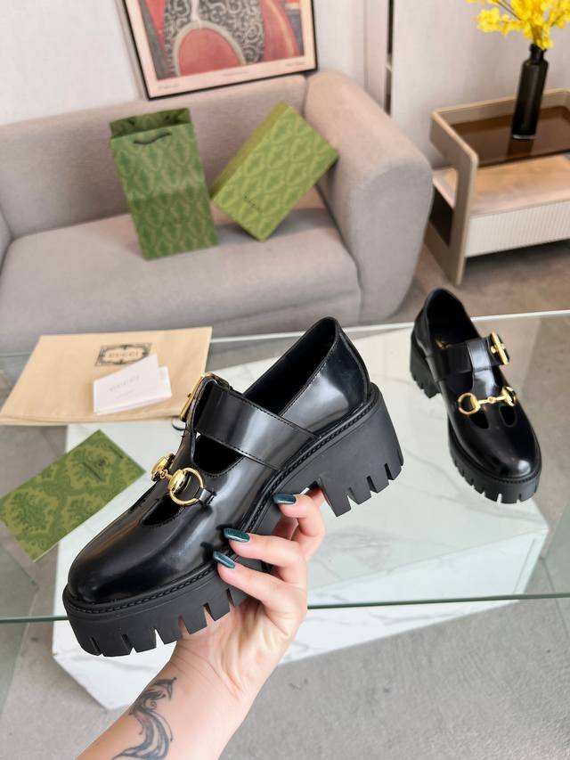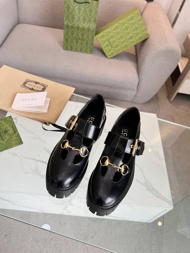 / 工厂价: Gucci饰马衔扣鞋扣与经典马衔扣女士乐福鞋,柔美而不失休闲。 黑色皮革 女士 金色调配件 马衔扣 橡胶沟纹鞋底 低跟 踝部搭扣固定,油边工艺。 面料